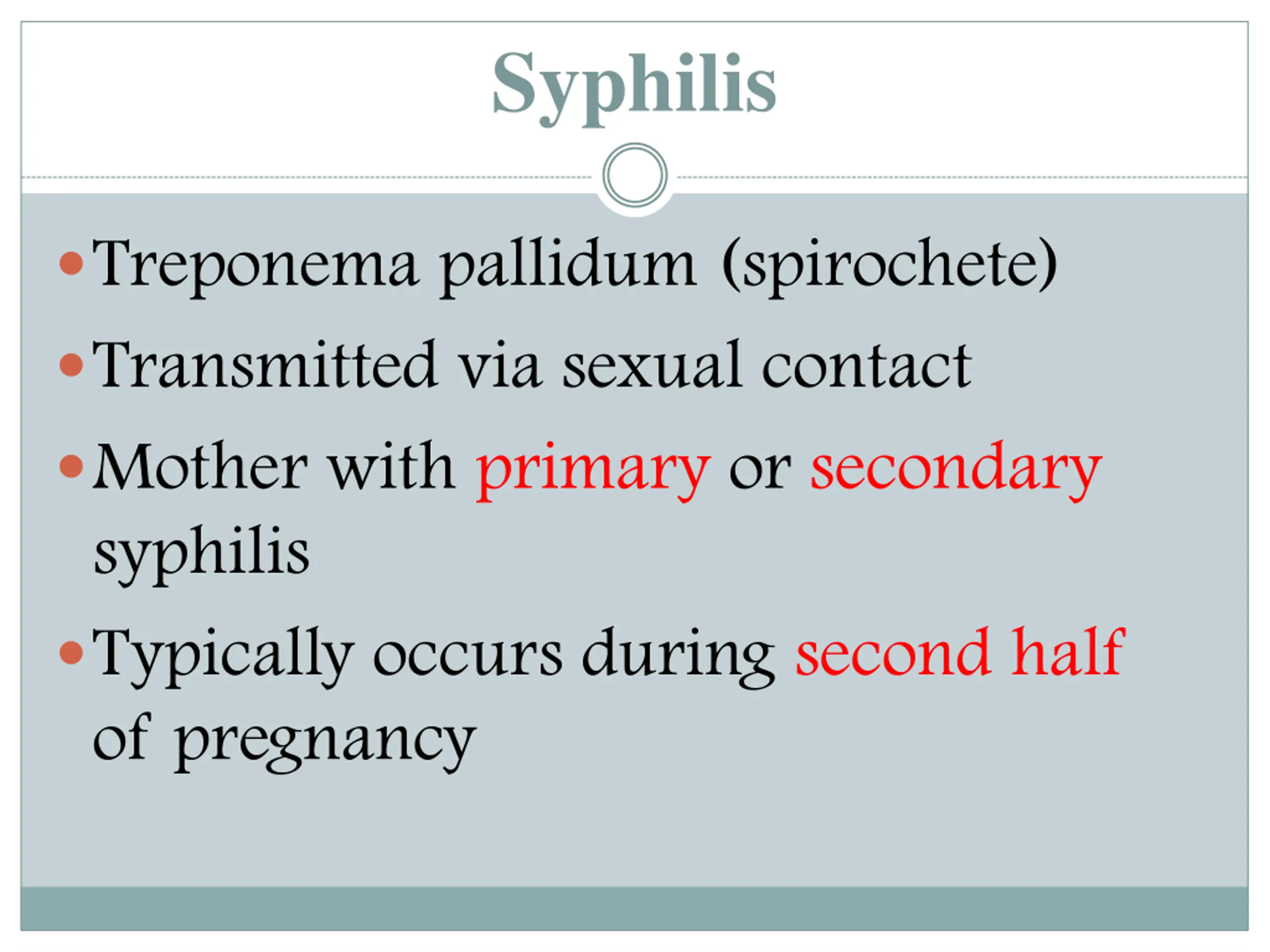 Syphilis Treponema pallidum (spirochete) Transmitted via sexual contact Mother with primary or secondary syphilis Typically occurs during second half of pregnancy