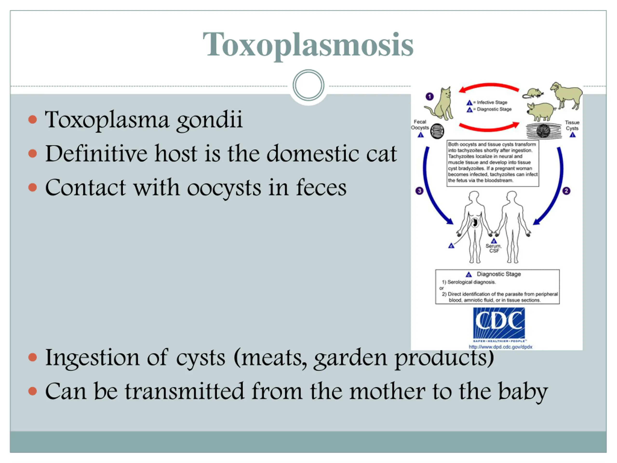 Toxoplasmosis Toxoplasma gondii Definitive host is the domestic cat Contact with oocysts in feces Ingestion of cysts (meats, garden products) Can be transmitted from the mother to the baby