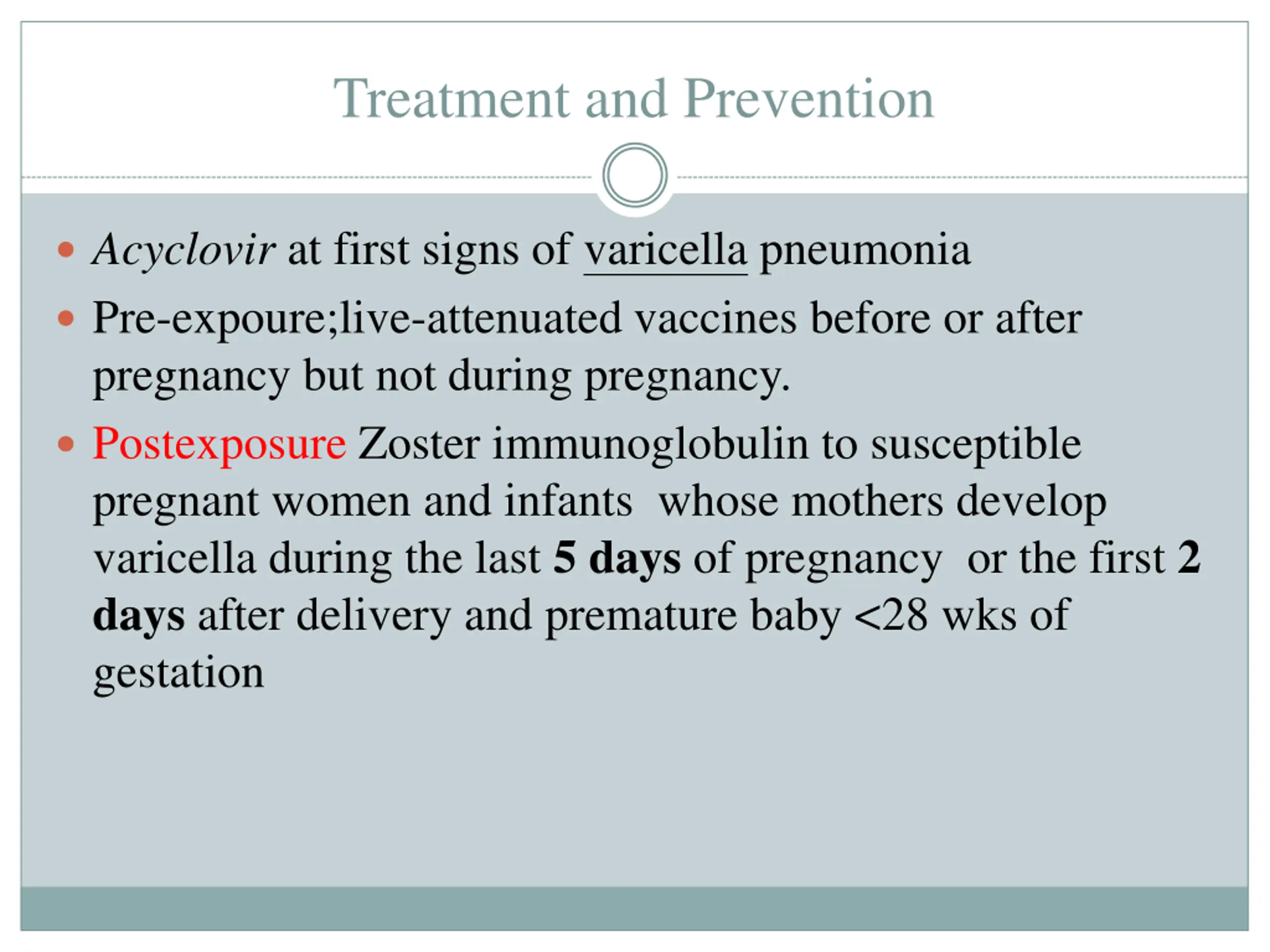 Treatment and Prevention Acyclovir at first signs of varicella pneumonia Pre-expoure;live-attenuated vaccines before or after pregnancy but not during pregnancy. Postexposure Zoster immunoglobulin to susceptible pregnant women and infants whose mothers develop varicella during the last 5 days of pregnancy or the first 2 days after delivery and premature baby <28 wks of gestation