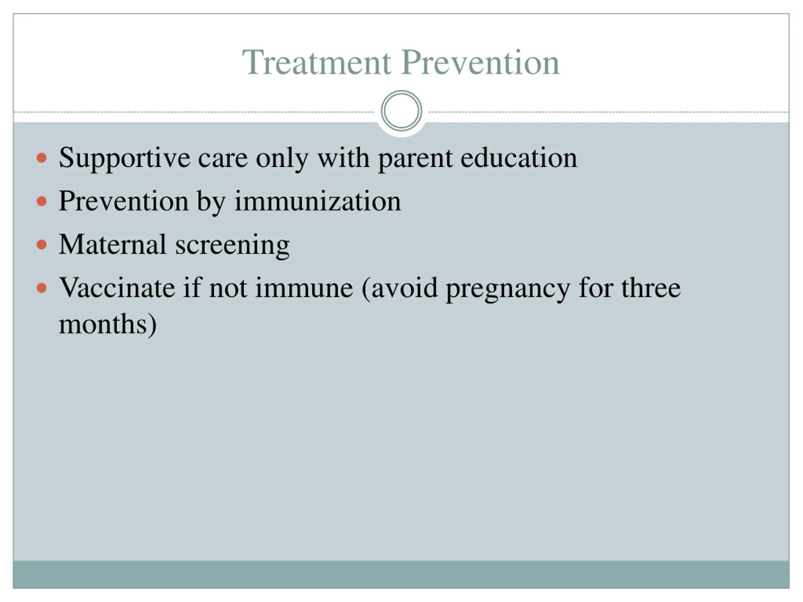 Treatment Prevention Supportive care only with parent education Prevention by immunization Maternal screening Vaccinate if not immune (avoid pregnancy for three months)