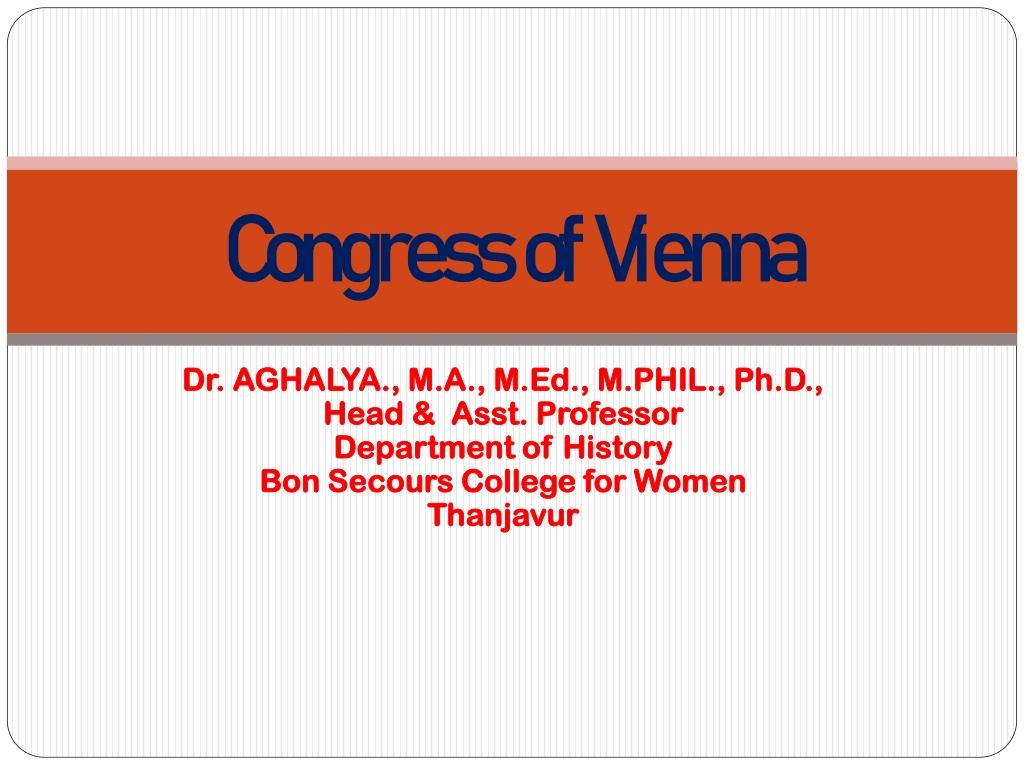 C ongress of Vienna Dr. AGHALYA., M.A., M.Ed., M.PHIL., Ph.D., Dr. AGHALYA., M.A., M.Ed., M.PHIL., Ph.D., Head & Asst. Professor Head & Asst. Professor Department of History Department of History Bon Secours College for Women Bon Secours College for Women Thanjavur Thanjavur