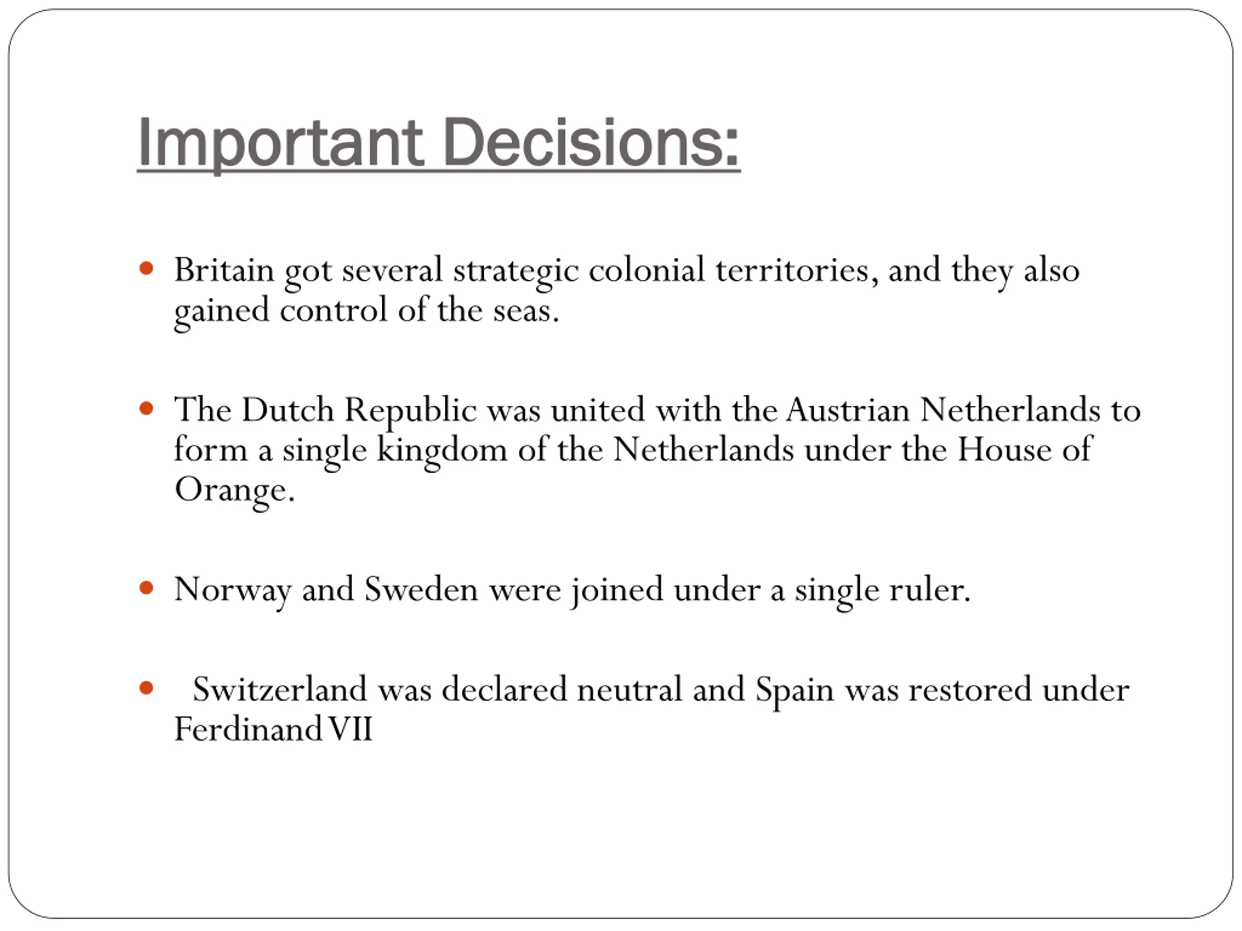 Important Decisions: Important Decisions: Britain got several strategic colonial territories, and they also gained control of the seas. The Dutch Republic was united with the Austrian Netherlands to form a single kingdom of the Netherlands under the House of Orange. Norway and Sweden were joined under a single ruler. Switzerland was declared neutral and Spain was restored under Ferdinand VII