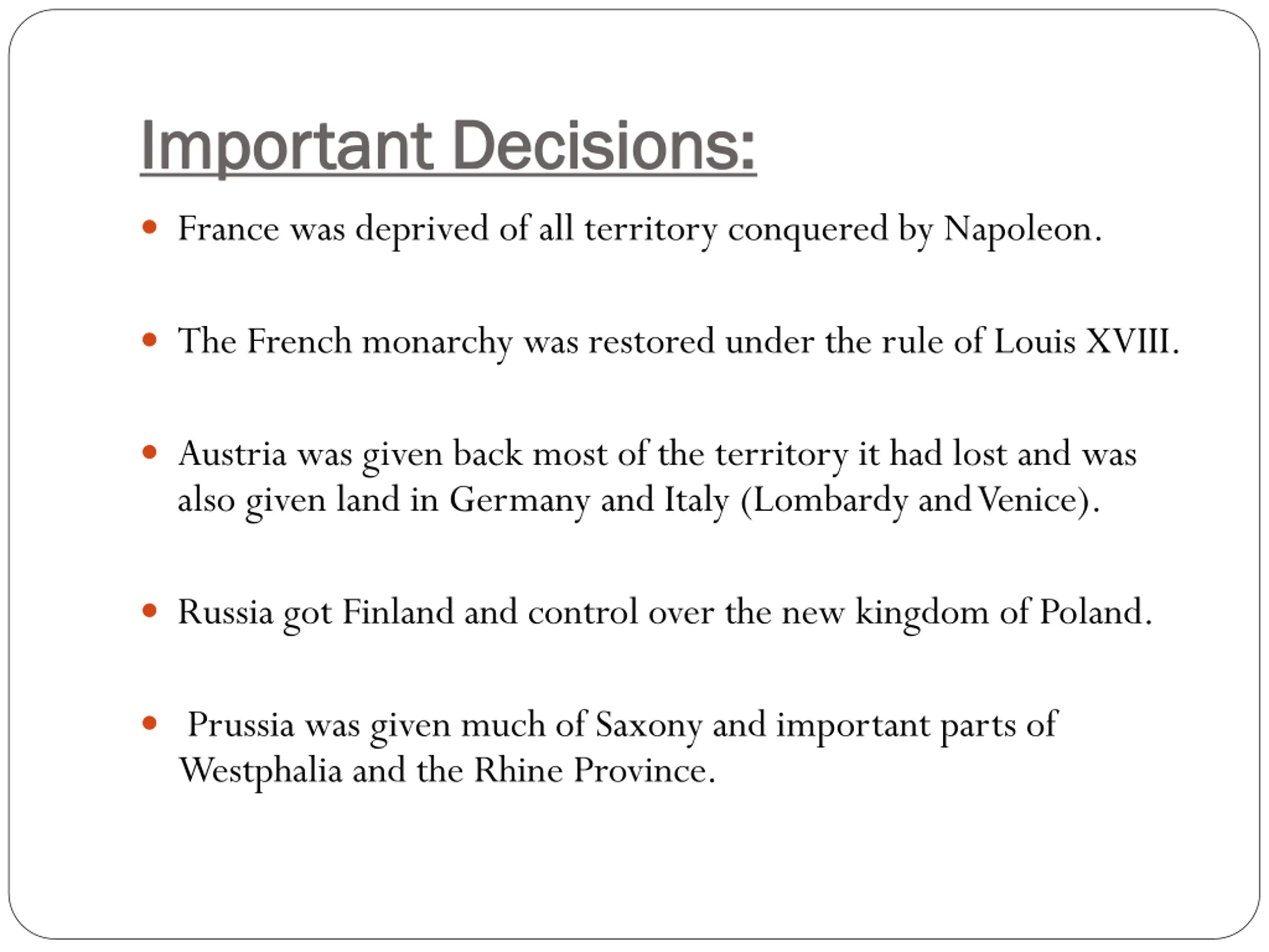 Important Decisions: Important Decisions: France was deprived of all territory conquered by Napoleon. The French monarchy was restored under the rule of Louis XVIII. Austria was given back most of the territory it had lost and was also given land in Germany and Italy (Lombardy and Venice). Russia got Finland and control over the new kingdom of Poland. Prussia was given much of Saxony and important parts of Westphalia and the Rhine Province.