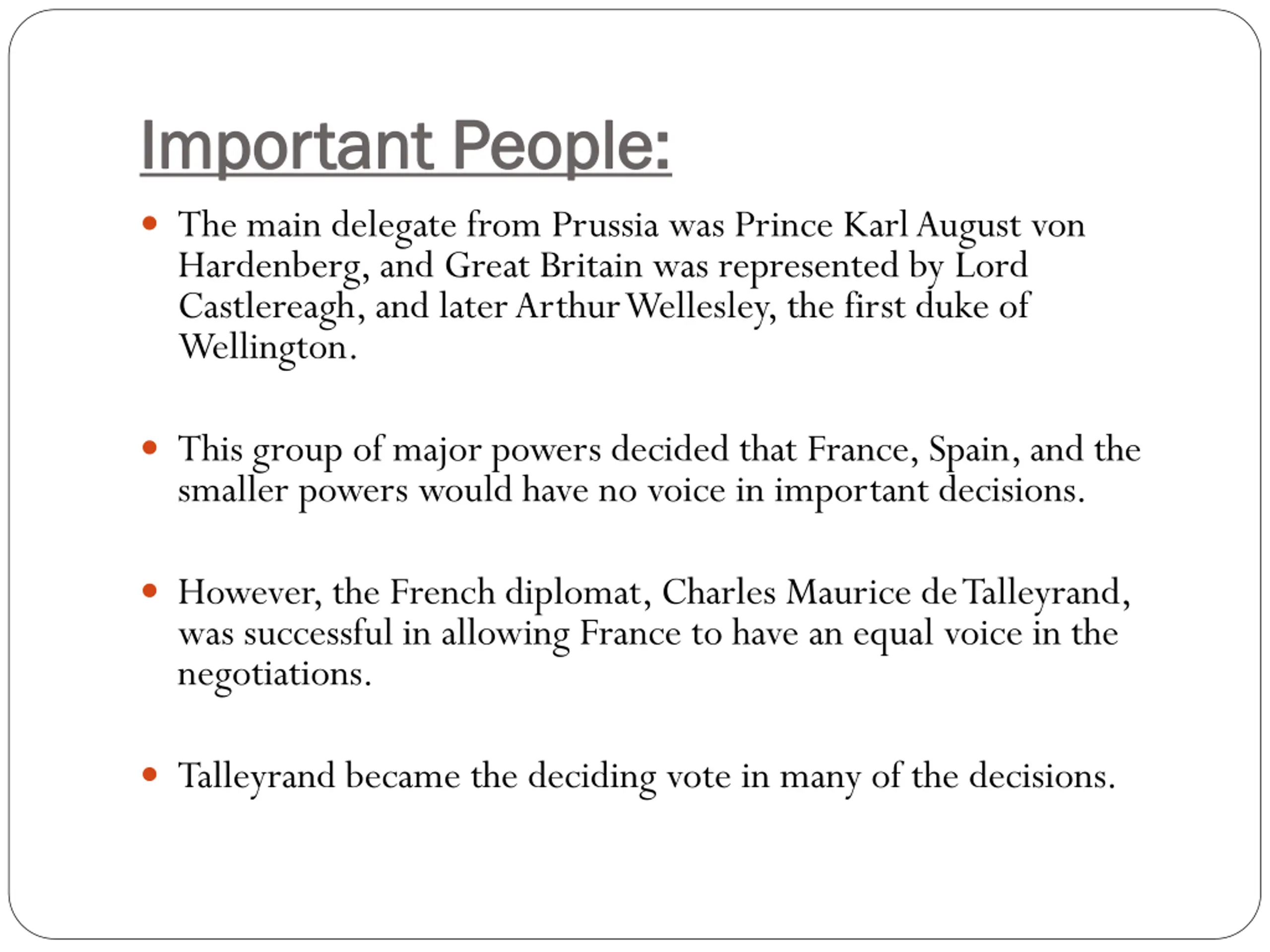 Important People: Important People: The main delegate from Prussia was Prince Karl August von Hardenberg, and Great Britain was represented by Lord Castlereagh, and later Arthur Wellesley, the first duke of Wellington. This group of major powers decided that France, Spain, and the smaller powers would have no voice in important decisions. However, the French diplomat, Charles Maurice de Talleyrand, was successful in allowing France to have an equal voice in the negotiations. Talleyrand became the deciding vote in many of the decisions.
