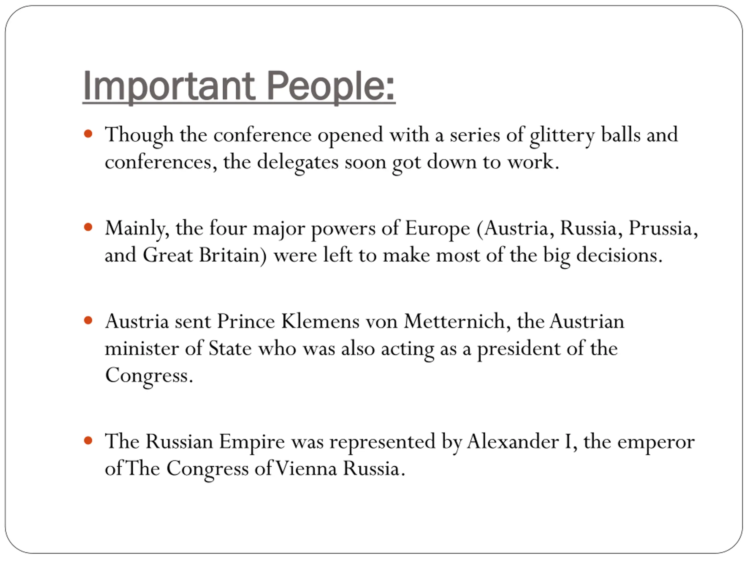 Important People: Important People: Though the conference opened with a series of glittery balls and conferences, the delegates soon got down to work. Mainly, the four major powers of Europe (Austria, Russia, Prussia, and Great Britain) were left to make most of the big decisions. Austria sent Prince Klemens von Metternich, the Austrian minister of State who was also acting as a president of the Congress. The Russian Empire was represented by Alexander I, the emperor of The Congress of Vienna Russia.