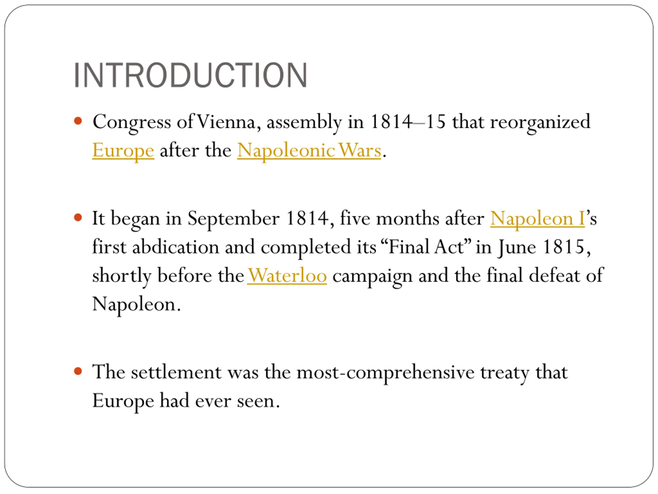 INTRODUCTION Congress of Vienna, assembly in 1814 15 that reorganized Europe after the Napoleonic Wars. It began in September 1814, five months after Napoleon I s first abdication and completed its Final Act in June 1815, shortly before the Waterloo campaign and the final defeat of Napoleon. The settlement was the most-comprehensive treaty that Europe had ever seen.