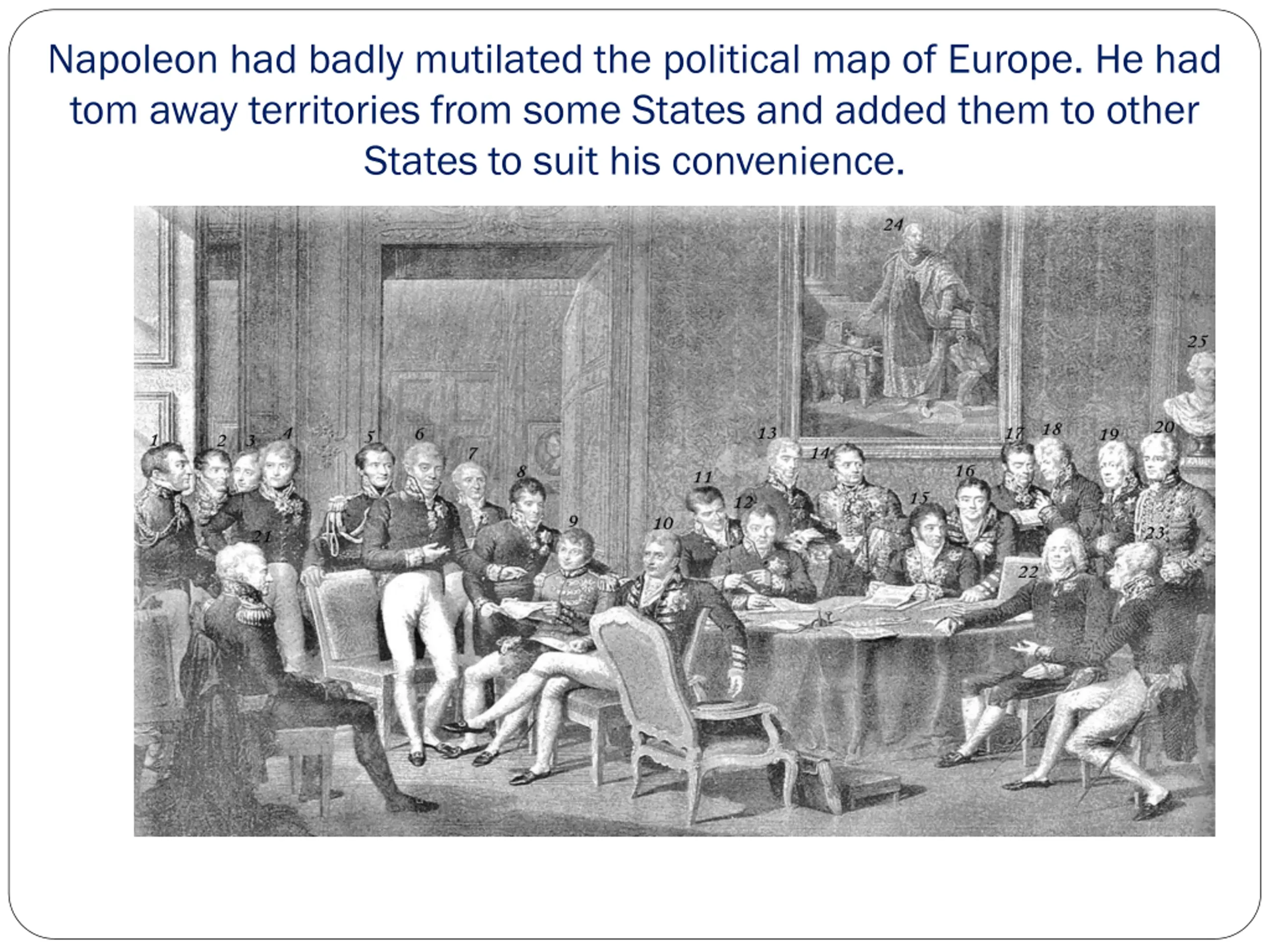 Napoleon had badly mutilated the political map of Europe. He had tom away territories from some States and added them to other States to suit his convenience.