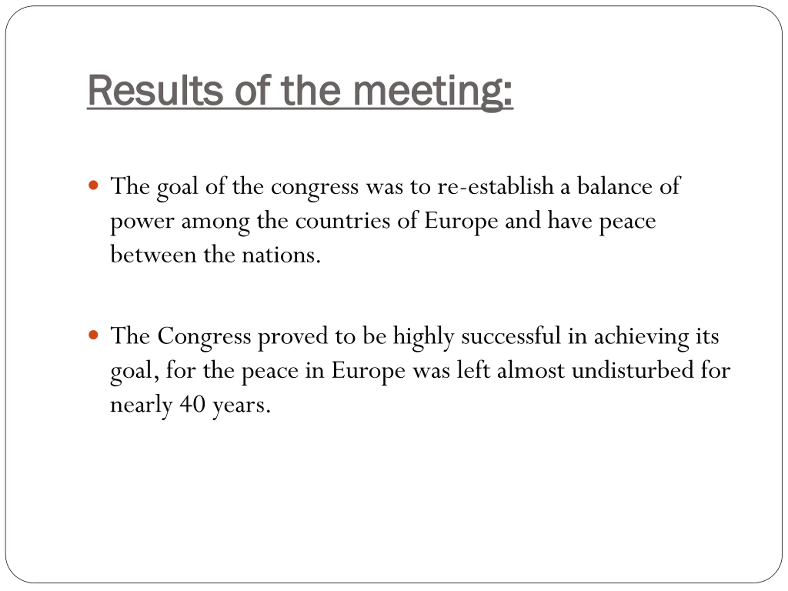 Results of the meeting: Results of the meeting: The goal of the congress was to re-establish a balance of power among the countries of Europe and have peace between the nations. The Congress proved to be highly successful in achieving its goal, for the peace in Europe was left almost undisturbed for nearly 40 years.