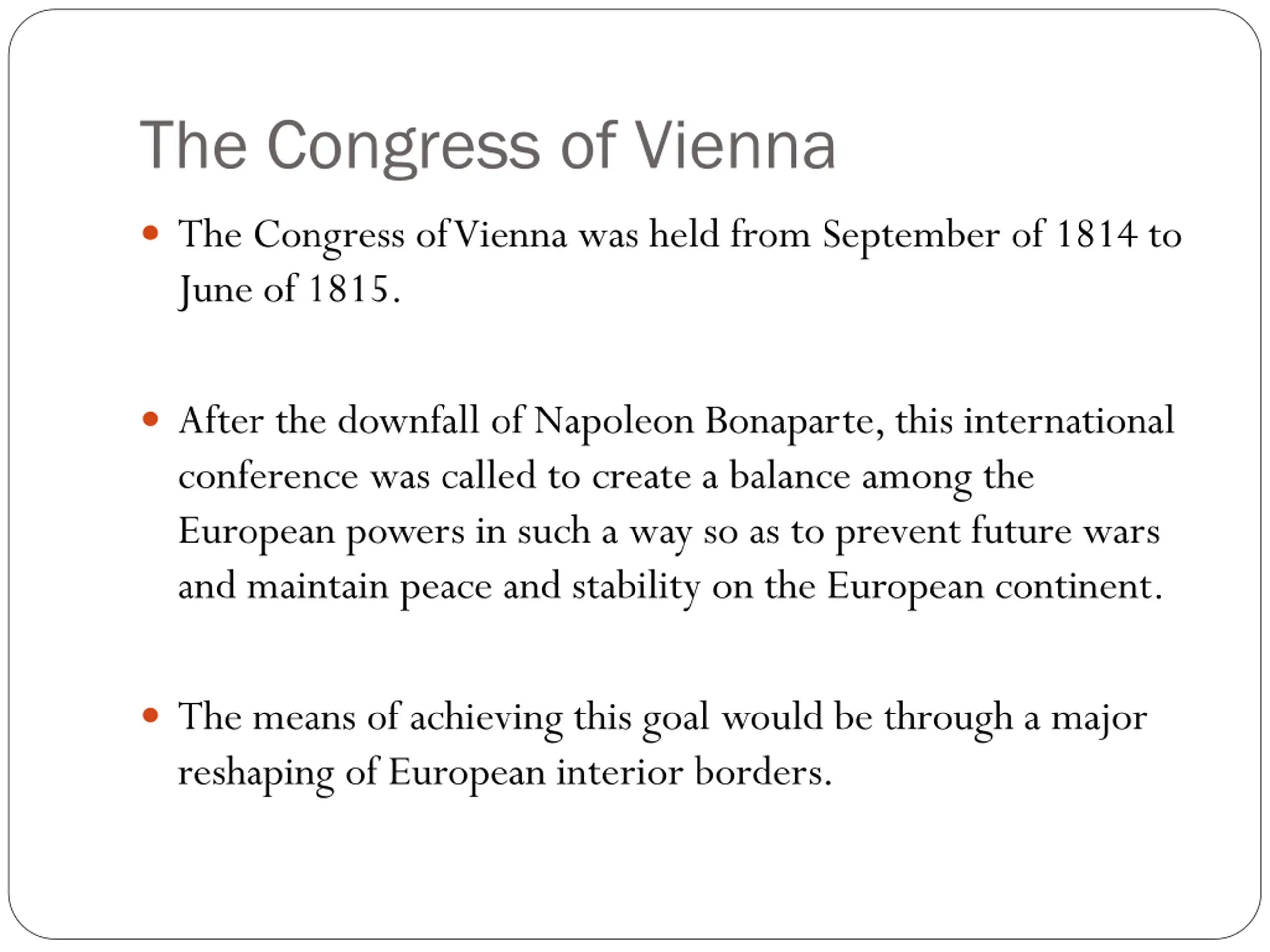 The Congress of Vienna The Congress of Vienna was held from September of 1814 to June of 1815. After the downfall of Napoleon Bonaparte, this international conference was called to create a balance among the European powers in such a way so as to prevent future wars and maintain peace and stability on the European continent. The means of achieving this goal would be through a major reshaping of European interior borders.