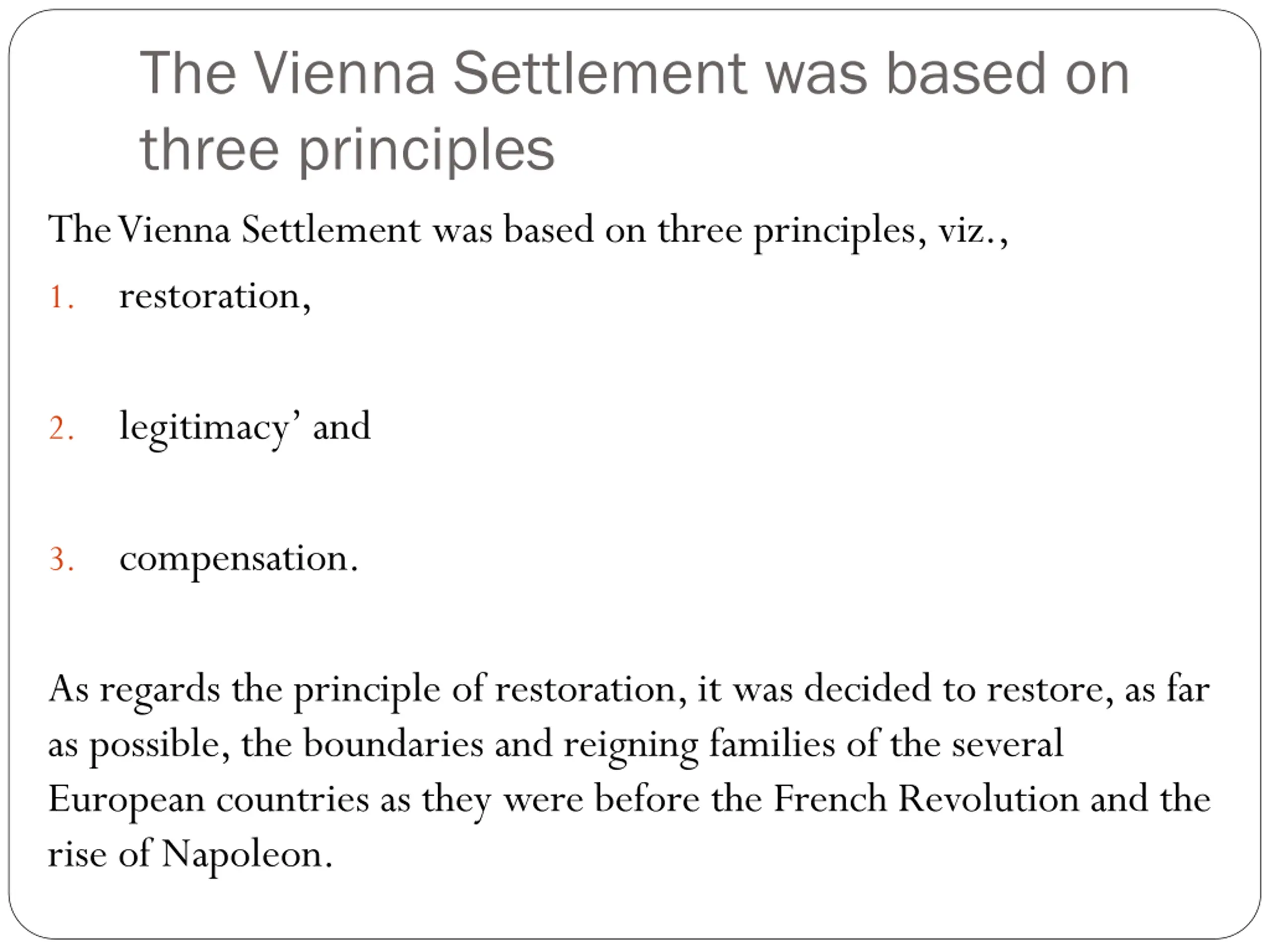 The Vienna Settlement was based on three principles The Vienna Settlement was based on three principles, viz., 1. restoration, legitimacy and 2. compensation. 3. As regards the principle of restoration, it was decided to restore, as far as possible, the boundaries and reigning families of the several European countries as they were before the French Revolution and the rise of Napoleon.