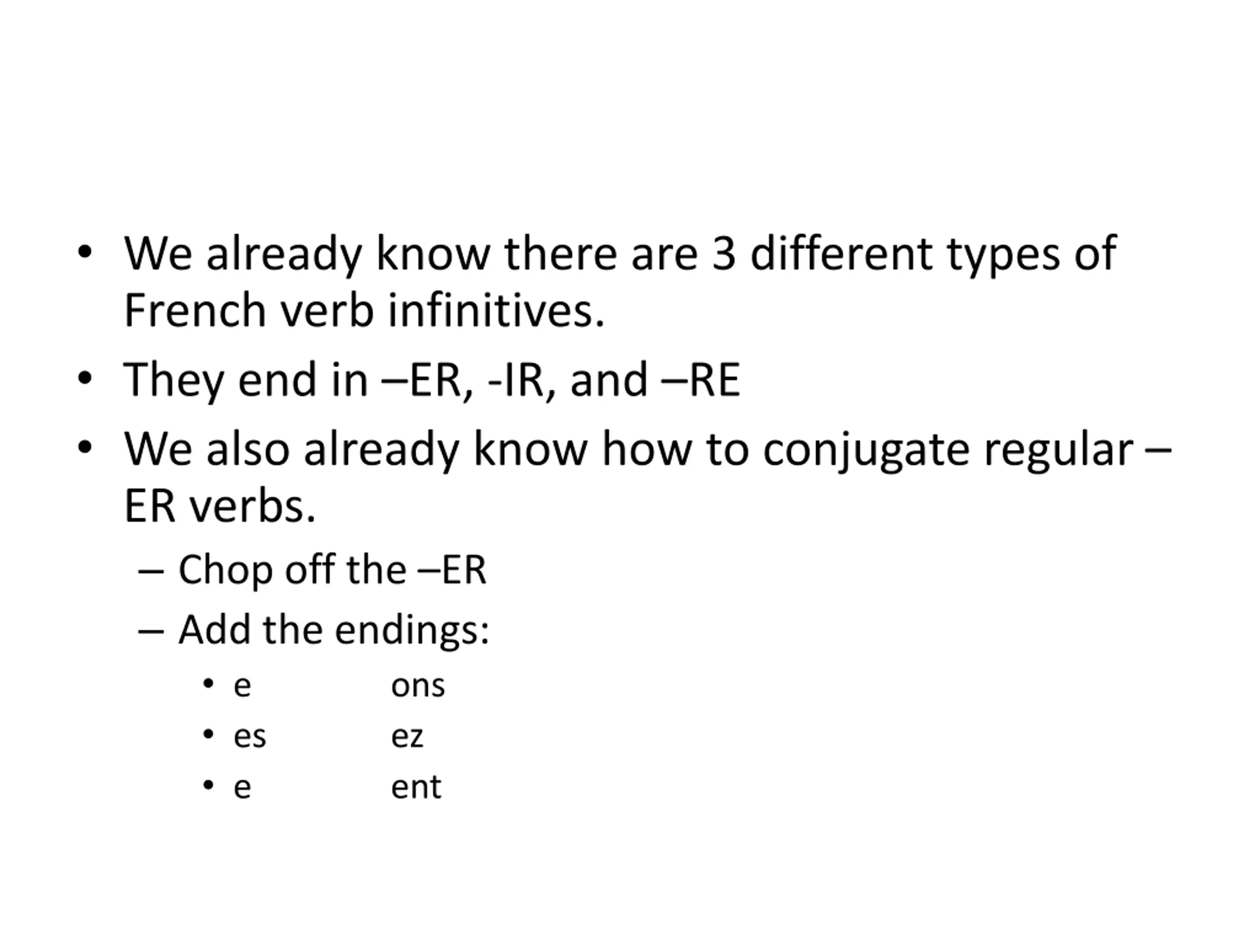 We already know there are 3 different types of French verb infinitives. They end in ER, -IR, and RE We also already know how to conjugate regular ER verbs. Chop off the ER Add the endings: e ons es ez e ent