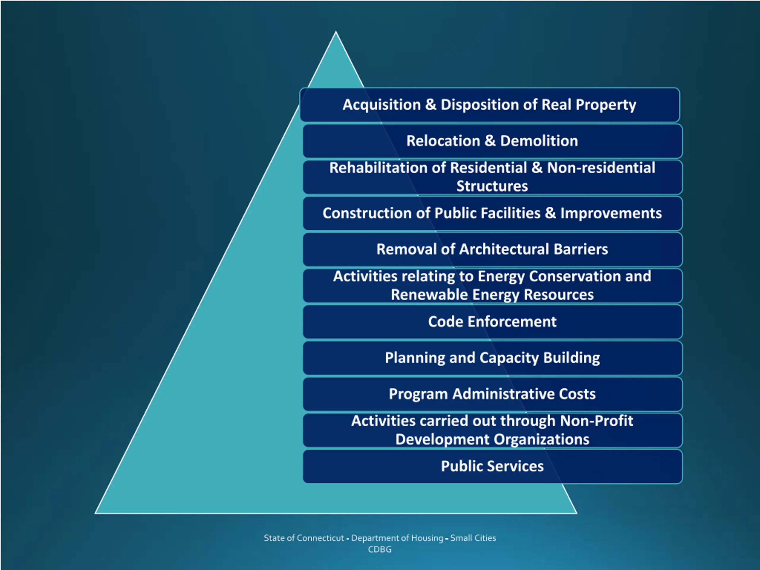 Acquisition & Disposition of Real Property Relocation & Demolition Rehabilitation of Residential & Non-residential Structures Construction of Public Facilities & Improvements Removal of Architectural Barriers Activities relating to Energy Conservation and Renewable Energy Resources Code Enforcement Planning and Capacity Building Program Administrative Costs Activities carried out through Non-Profit Development Organizations Public Services State of Connecticut - Department of Housing - Small Cities CDBG