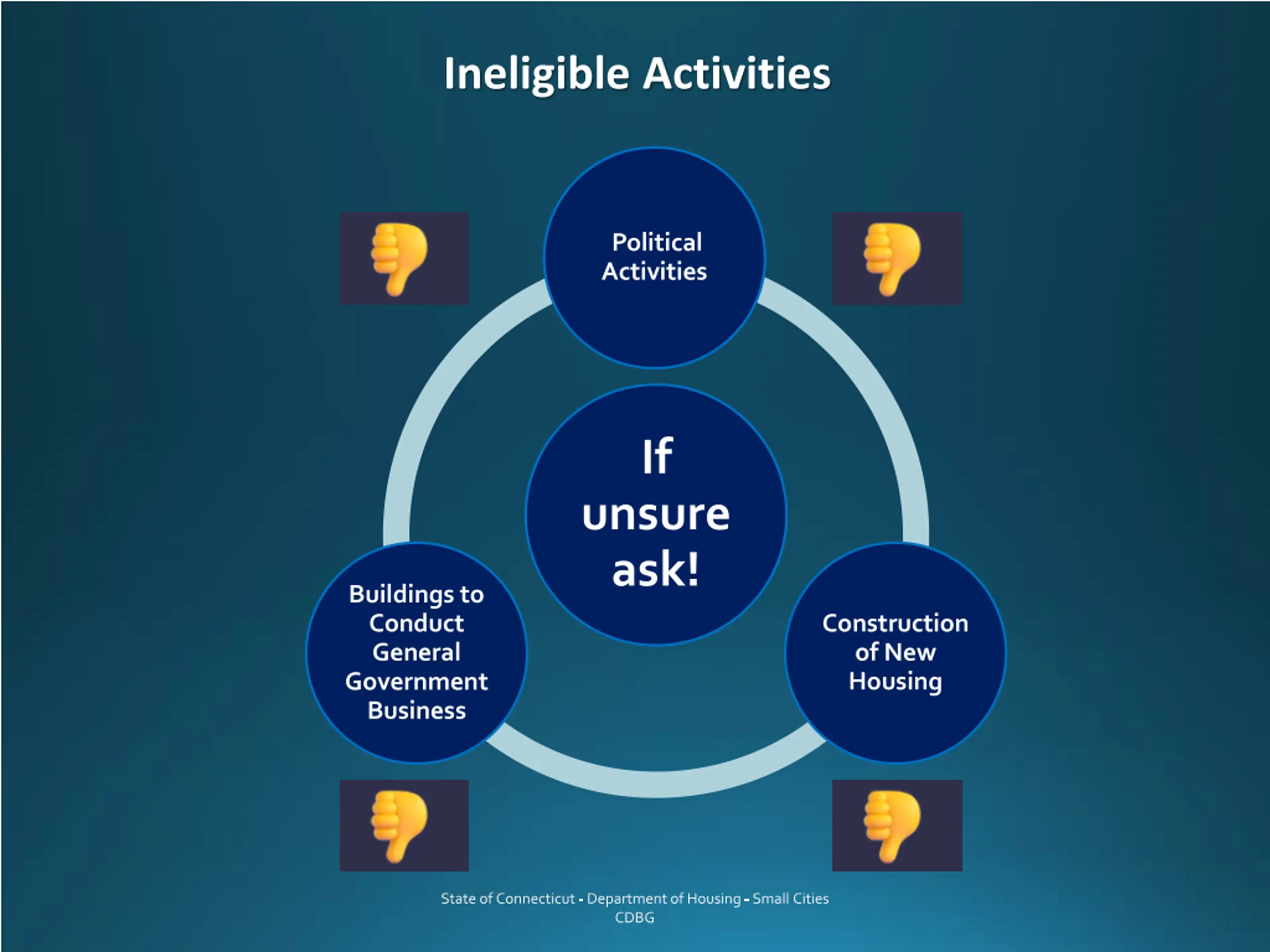 Ineligible Activities Political Activities If unsure ask! Buildings to Conduct General Government Business Construction of New Housing State of Connecticut - Department of Housing - Small Cities CDBG