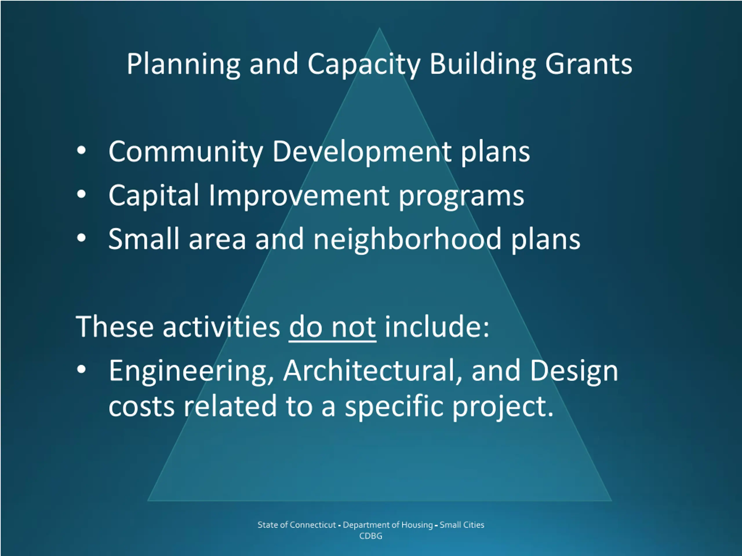 Planning and Capacity Building Grants Community Development plans Capital Improvement programs Small area and neighborhood plans These activities do not include: Engineering, Architectural, and Design costs related to a specific project. State of Connecticut - Department of Housing - Small Cities CDBG