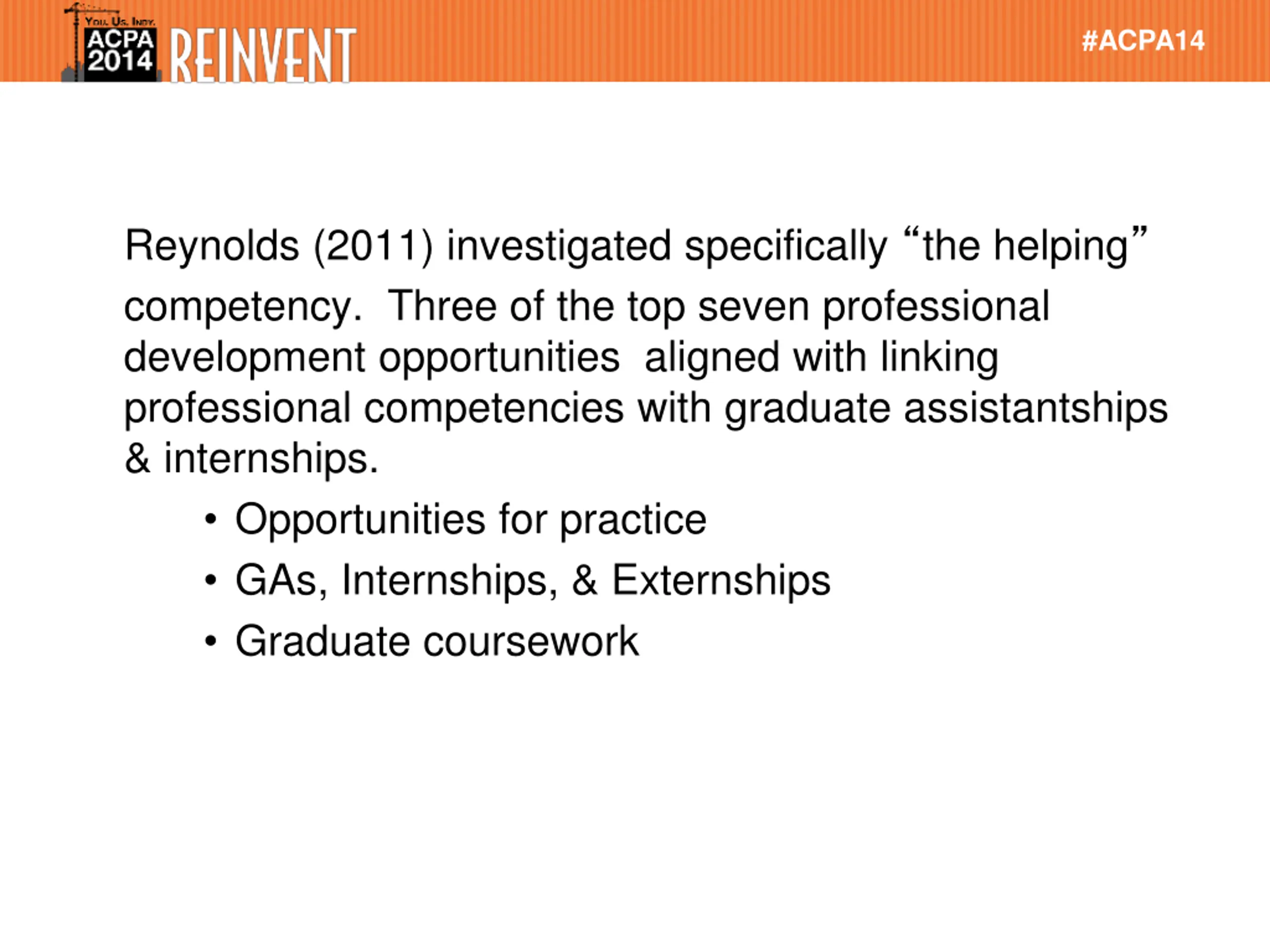 #ACPA14 Reynolds (2011) investigated specifically the helping competency. Three of the top seven professional development opportunities aligned with linking professional competencies with graduate assistantships & internships. Opportunities for practice GAs, Internships, & Externships Graduate coursework