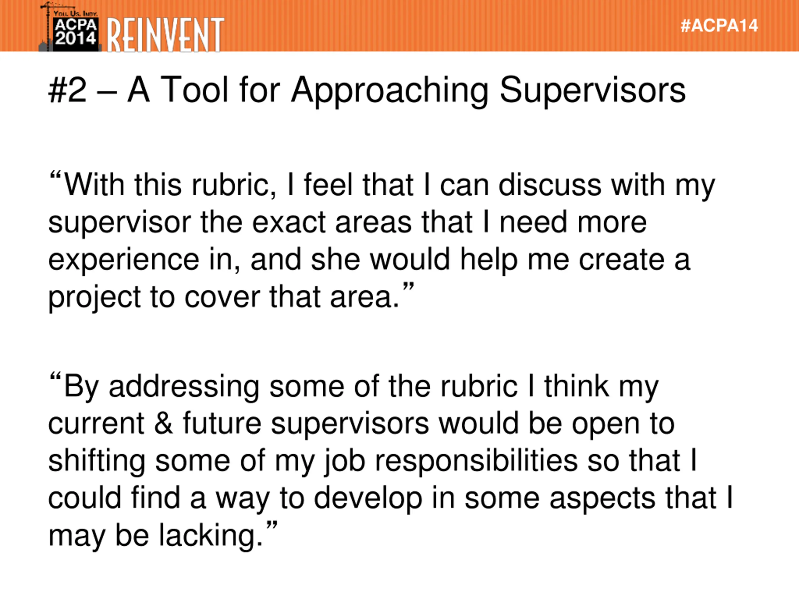 #ACPA14 #2 A Tool for Approaching Supervisors With this rubric, I feel that I can discuss with my supervisor the exact areas that I need more experience in, and she would help me create a project to cover that area. By addressing some of the rubric I think my current & future supervisors would be open to shifting some of my job responsibilities so that I could find a way to develop in some aspects that I may be lacking.