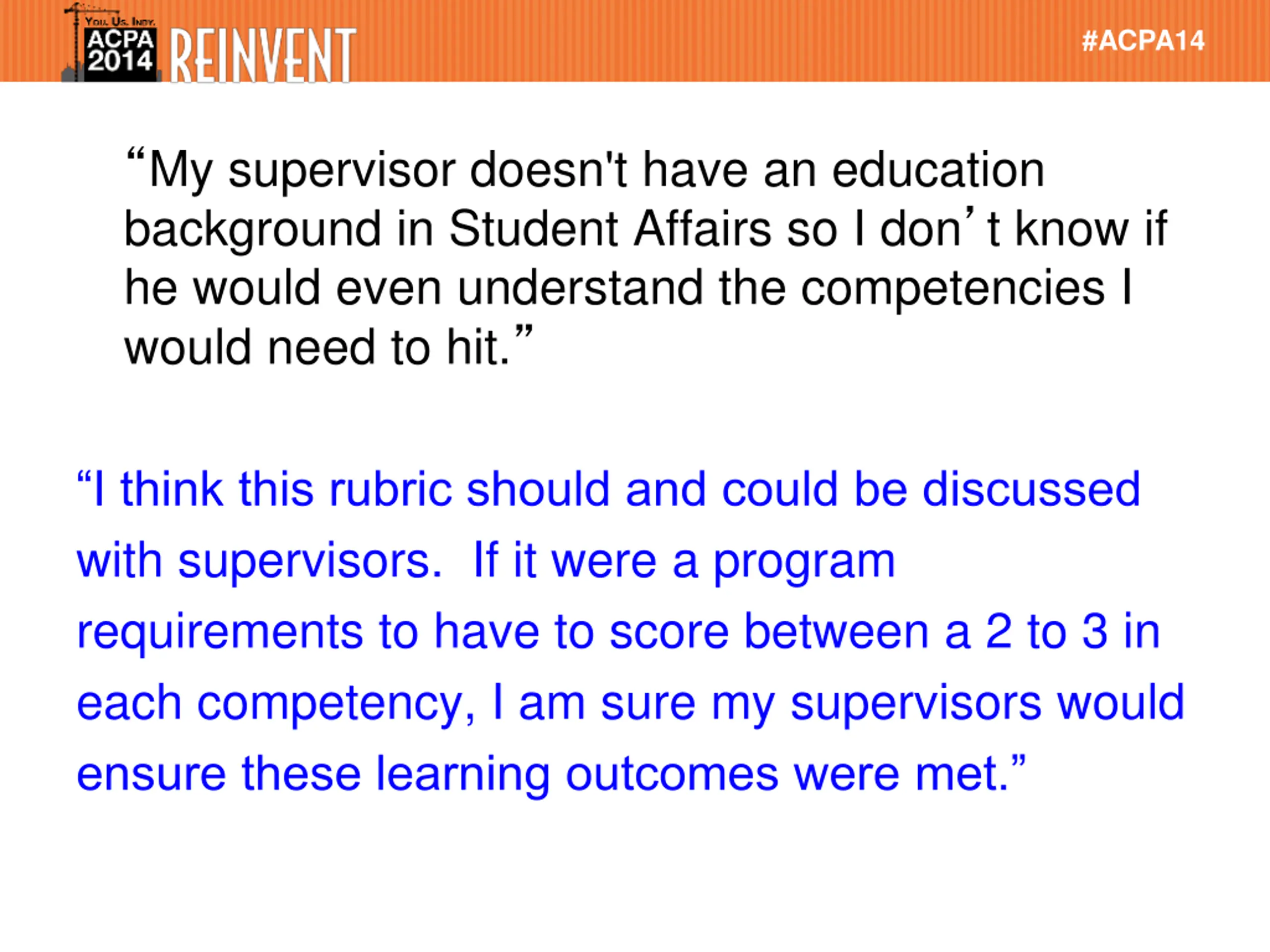 #ACPA14 My supervisor doesn't have an education background in Student Affairs so I don t know if he would even understand the competencies I would need to hit. I think this rubric should and could be discussed with supervisors. If it were a program requirements to have to score between a 2 to 3 in each competency, I am sure my supervisors would ensure these learning outcomes were met.