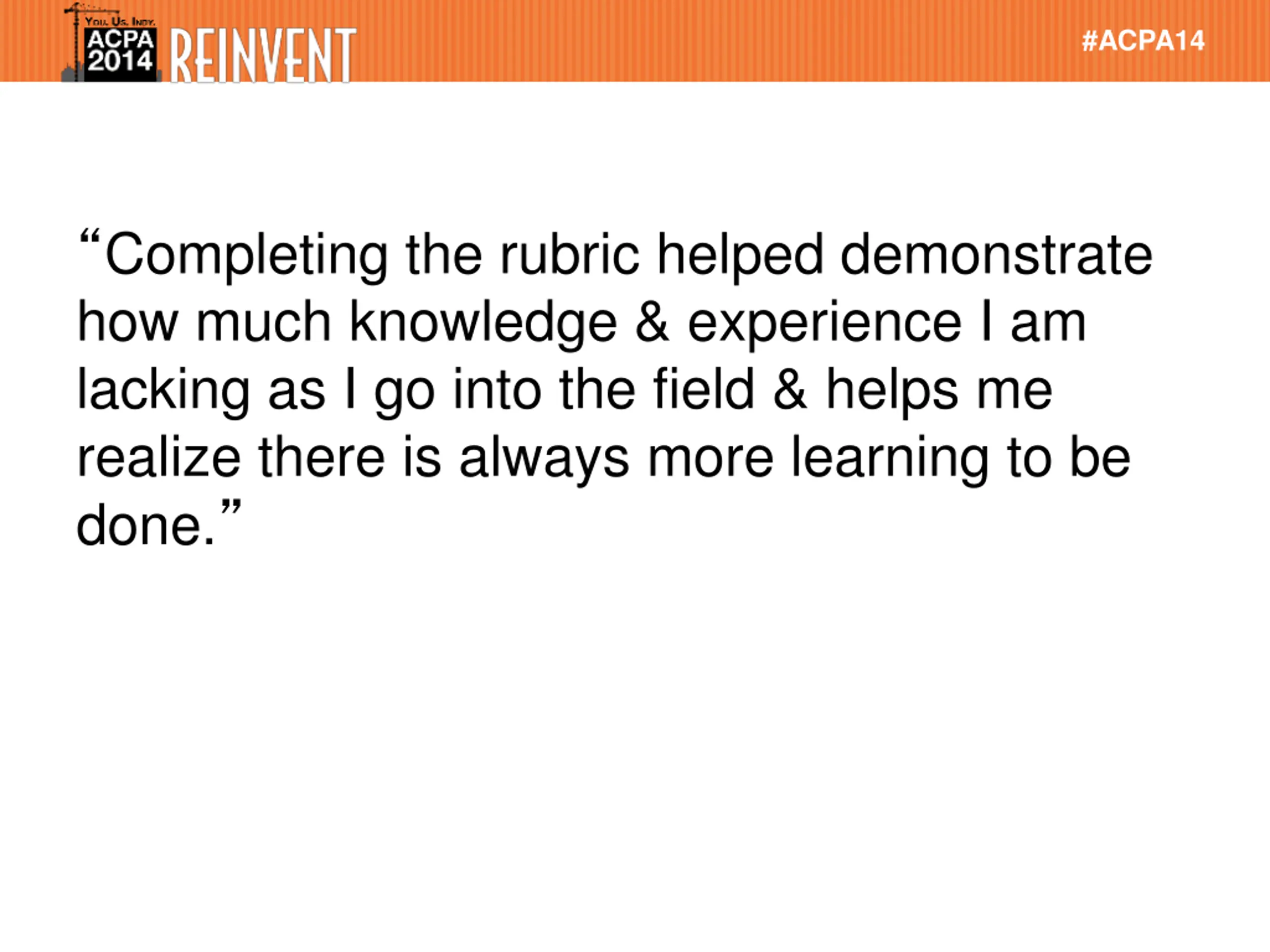 #ACPA14 Completing the rubric helped demonstrate how much knowledge & experience I am lacking as I go into the field & helps me realize there is always more learning to be done.