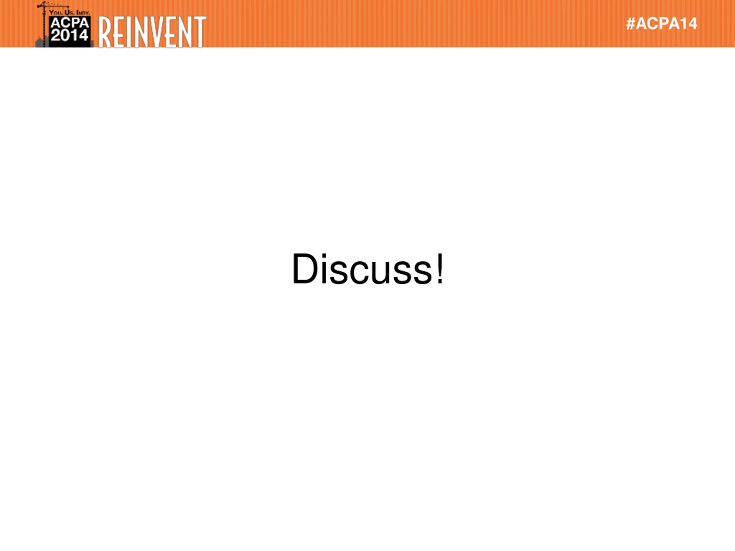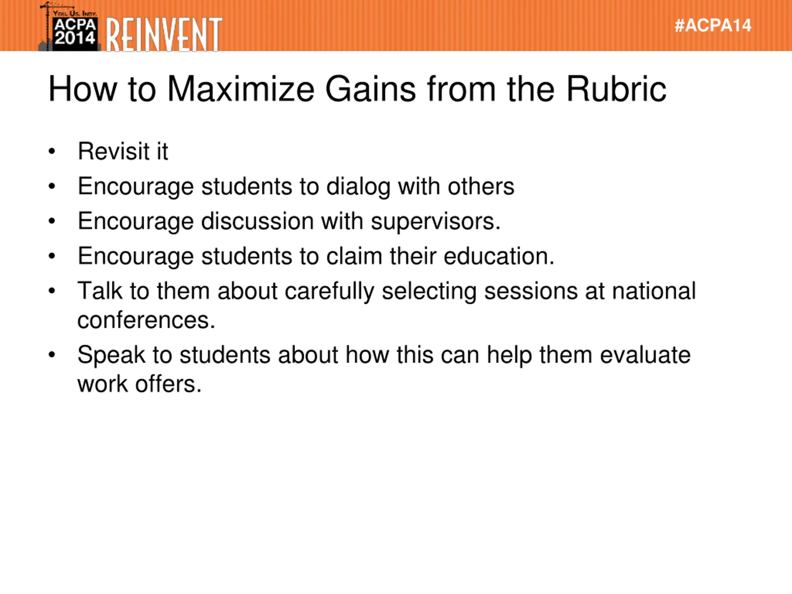#ACPA14 How to Maximize Gains from the Rubric Revisit it Encourage students to dialog with others Encourage discussion with supervisors. Encourage students to claim their education. Talk to them about carefully selecting sessions at national conferences. Speak to students about how this can help them evaluate work offers.
