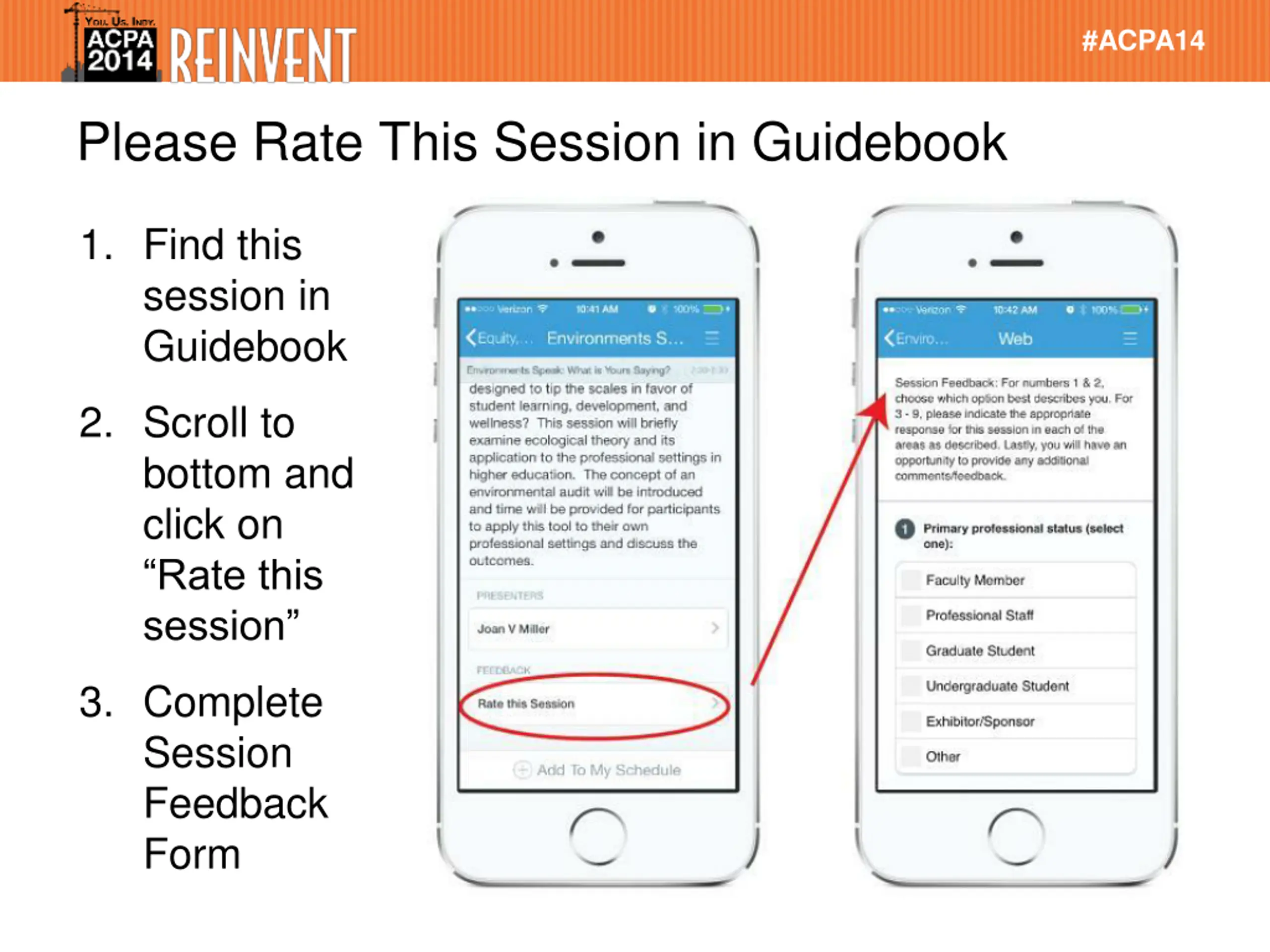 #ACPA14 Please Rate This Session in Guidebook 1. Find this session in Guidebook 2. Scroll to bottom and click on Rate this session 3. Complete Session Feedback Form