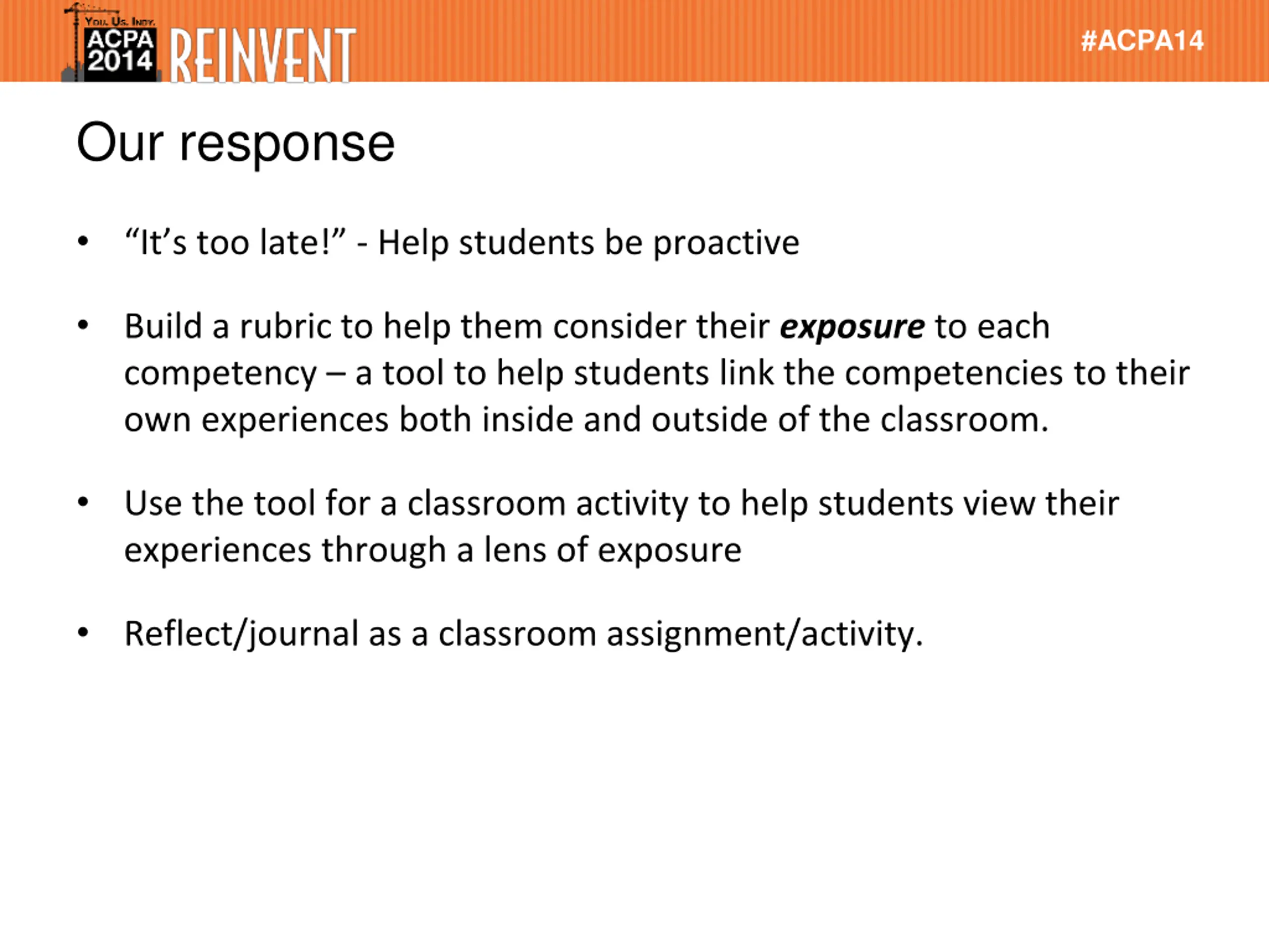 #ACPA14 Our response It s too late! - Help students be proactive Build a rubric to help them consider their exposure to each competency a tool to help students link the competencies to their own experiences both inside and outside of the classroom. Use the tool for a classroom activity to help students view their experiences through a lens of exposure Reflect/journal as a classroom assignment/activity.