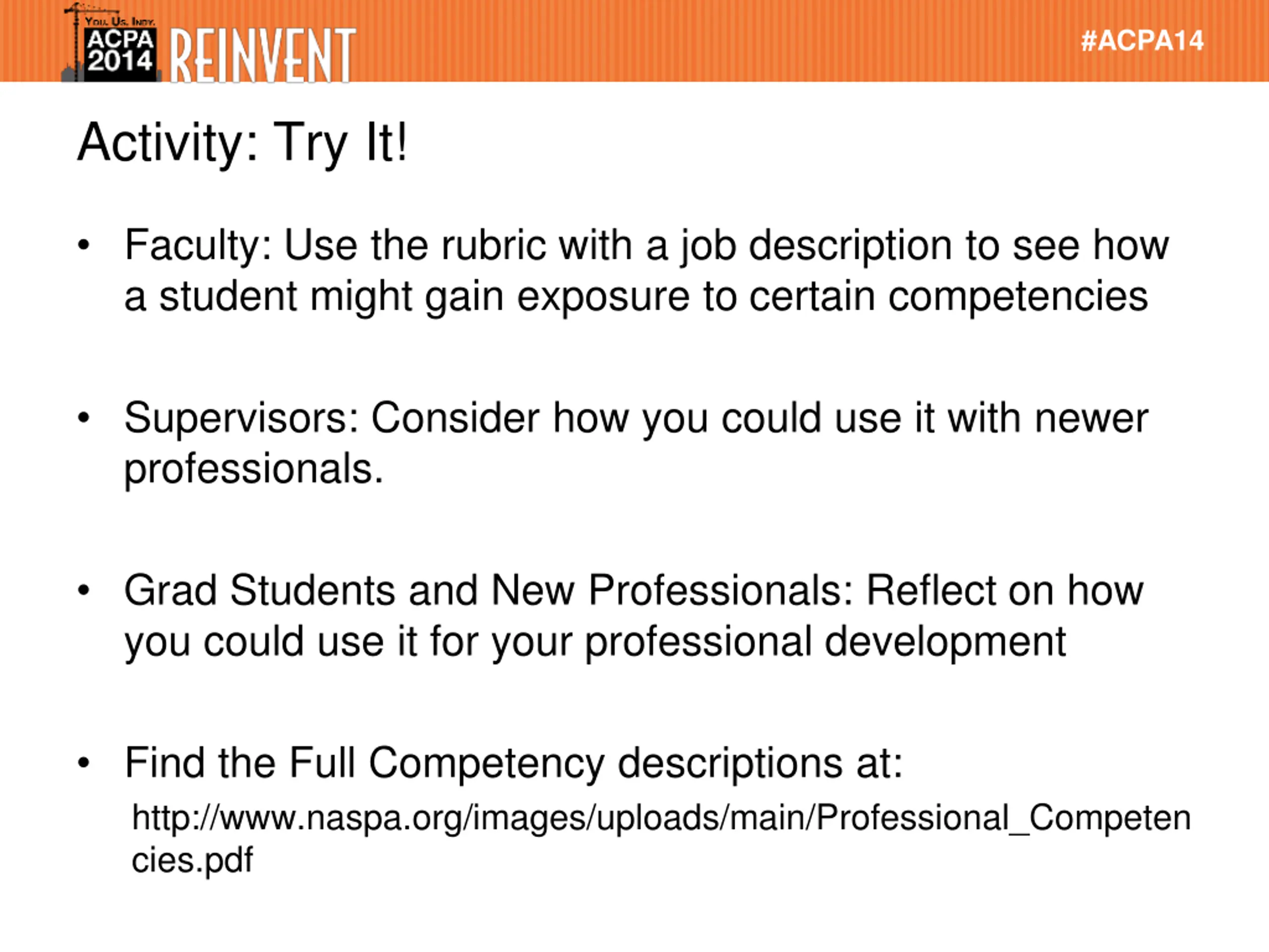 #ACPA14 Activity: Try It! Faculty: Use the rubric with a job description to see how a student might gain exposure to certain competencies Supervisors: Consider how you could use it with newer professionals. Grad Students and New Professionals: Reflect on how you could use it for your professional development Find the Full Competency descriptions at: http://www.naspa.org/images/uploads/main/Professional_Competen cies.pdf