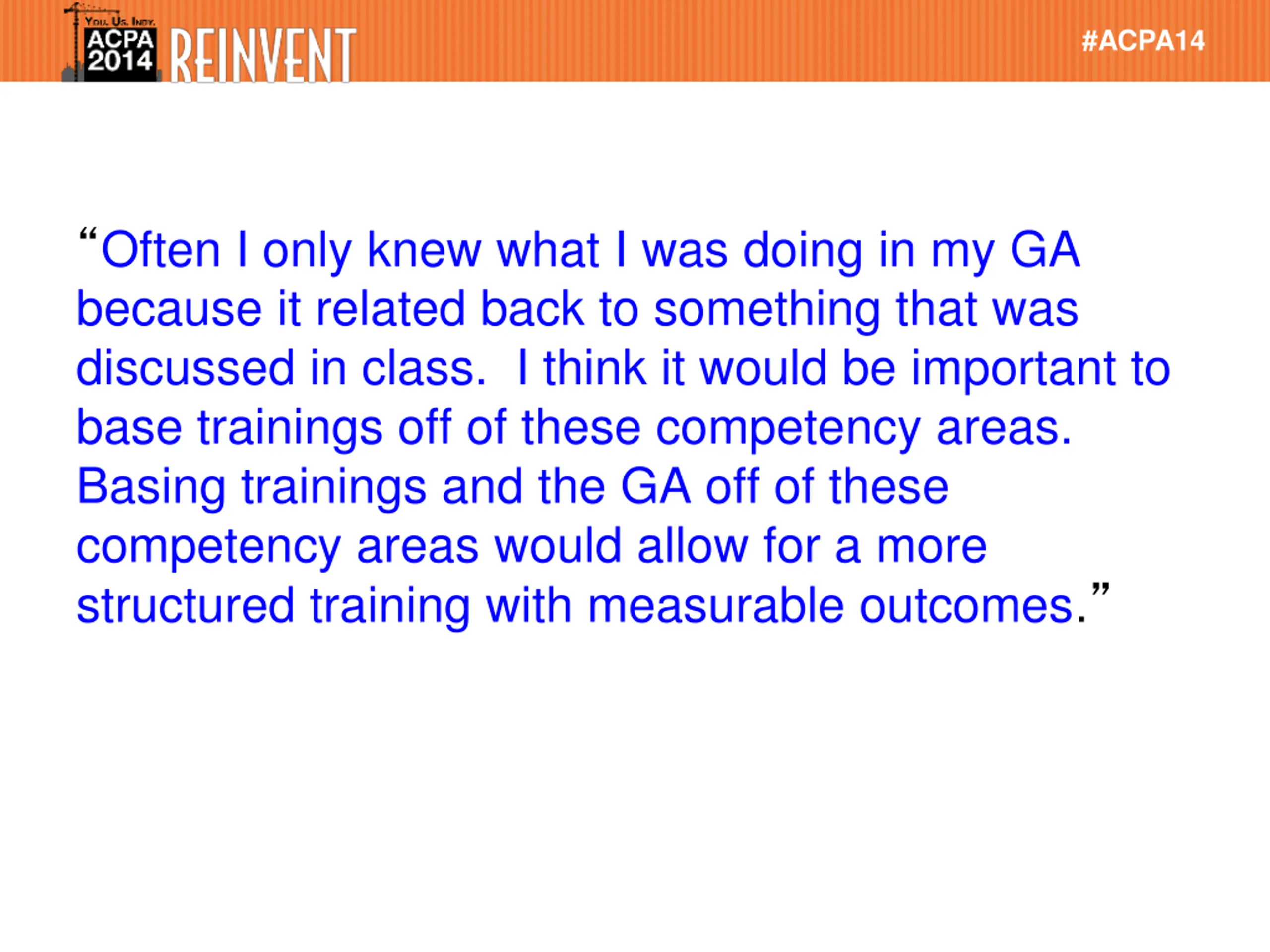 #ACPA14 Often I only knew what I was doing in my GA because it related back to something that was discussed in class. I think it would be important to base trainings off of these competency areas. Basing trainings and the GA off of these competency areas would allow for a more structured training with measurable outcomes.