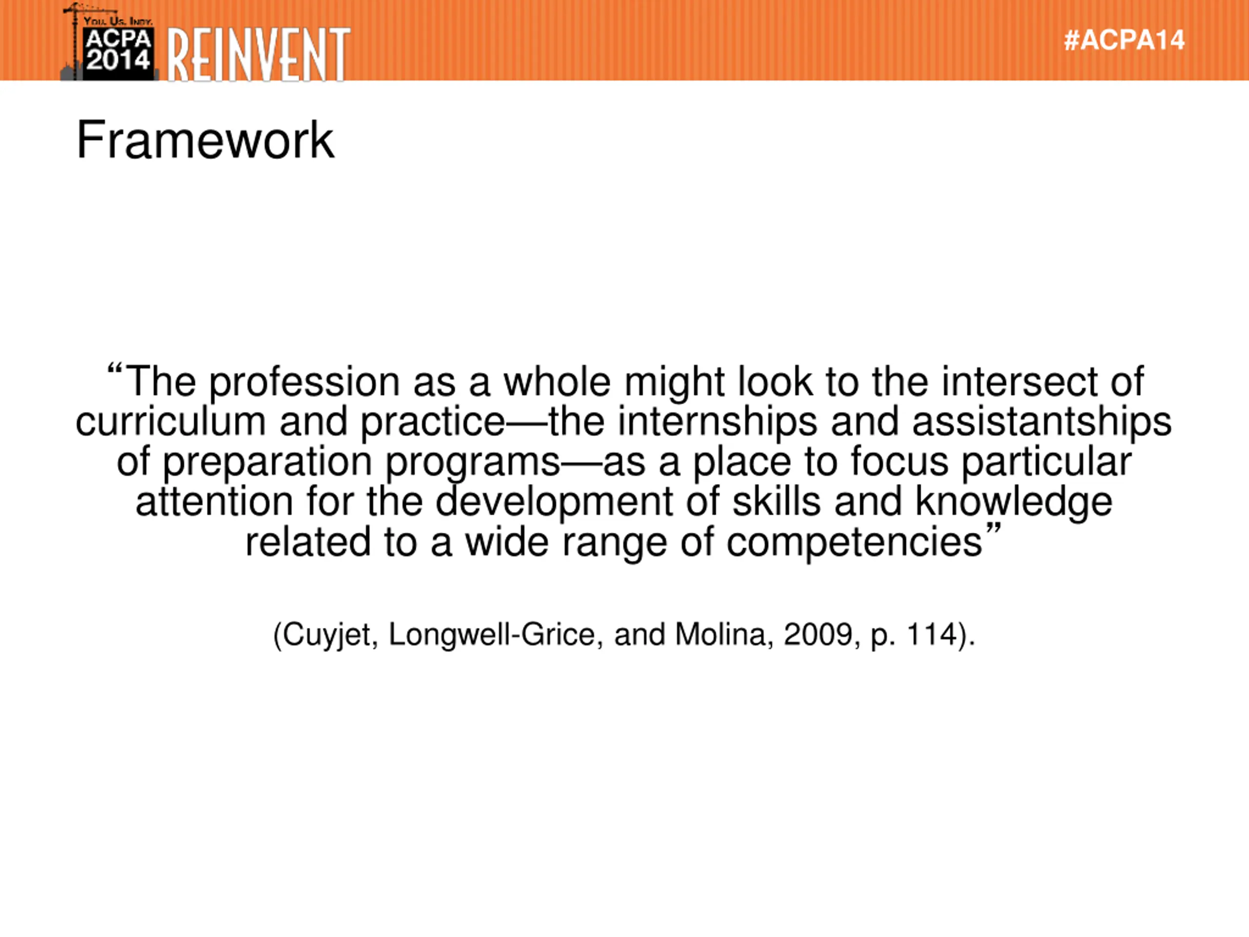 #ACPA14 Framework The profession as a whole might look to the intersect of curriculum and practice the internships and assistantships of preparation programs as a place to focus particular attention for the development of skills and knowledge related to a wide range of competencies (Cuyjet, Longwell-Grice, and Molina, 2009, p. 114).
