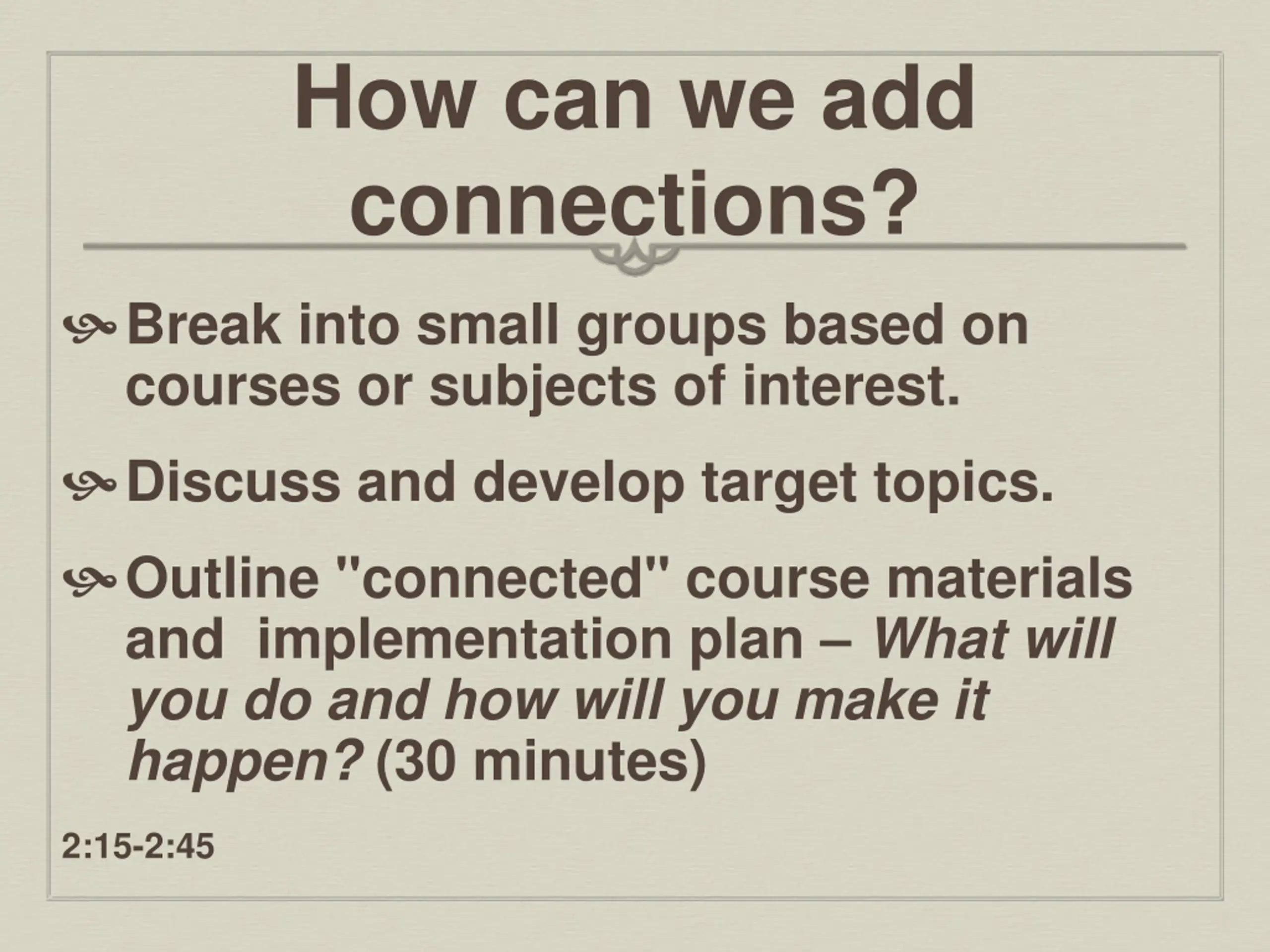 How can we add connections? Break into small groups based on courses or subjects of interest. Discuss and develop target topics. Outline "connected" course materials and implementation plan What will you do and how will you make it happen? (30 minutes) 2:15-2:45