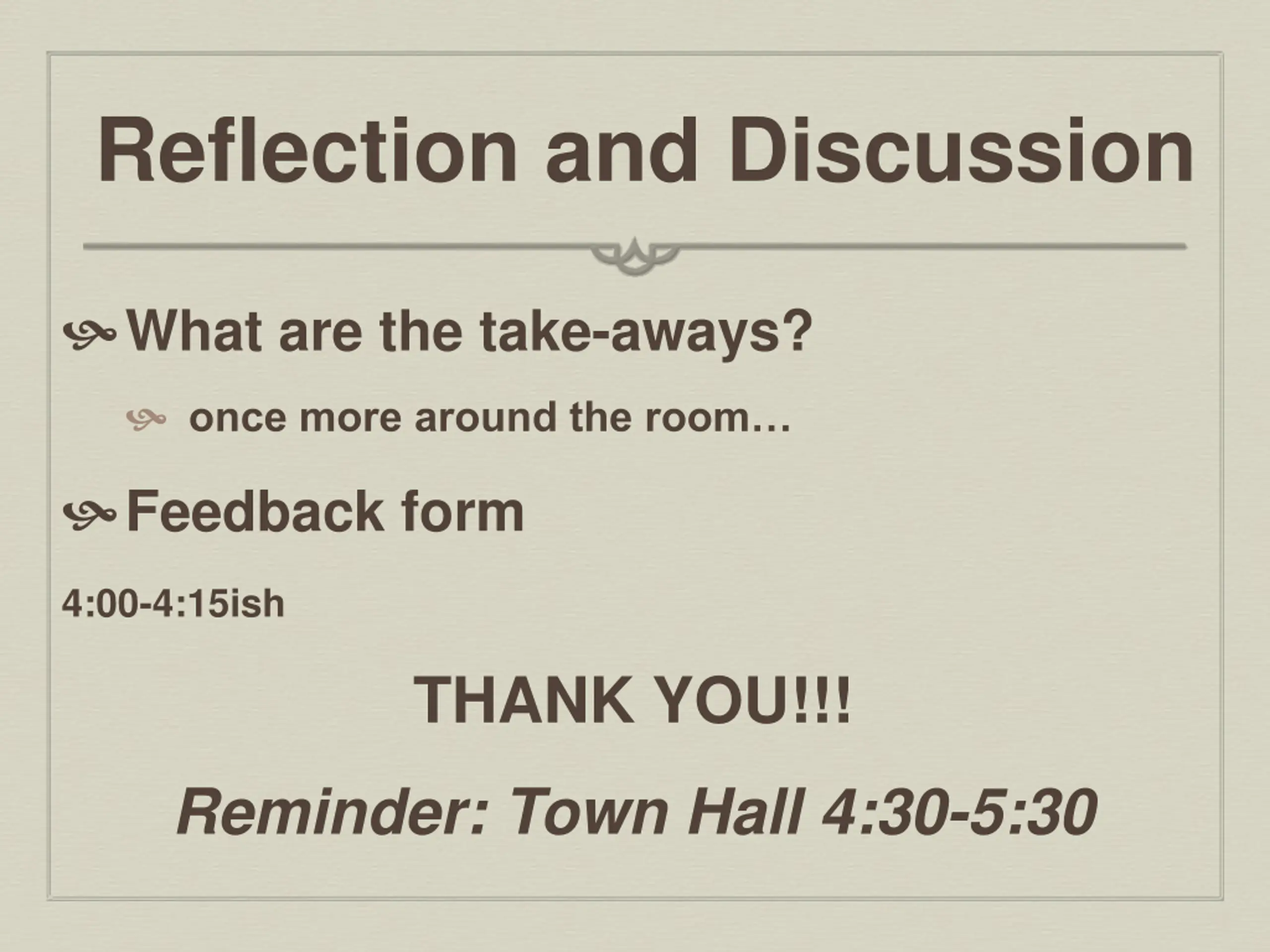Reflection and Discussion What are the take-aways? once more around the room Feedback form 4:00-4:15ish THANK YOU!!! Reminder: Town Hall 4:30-5:30