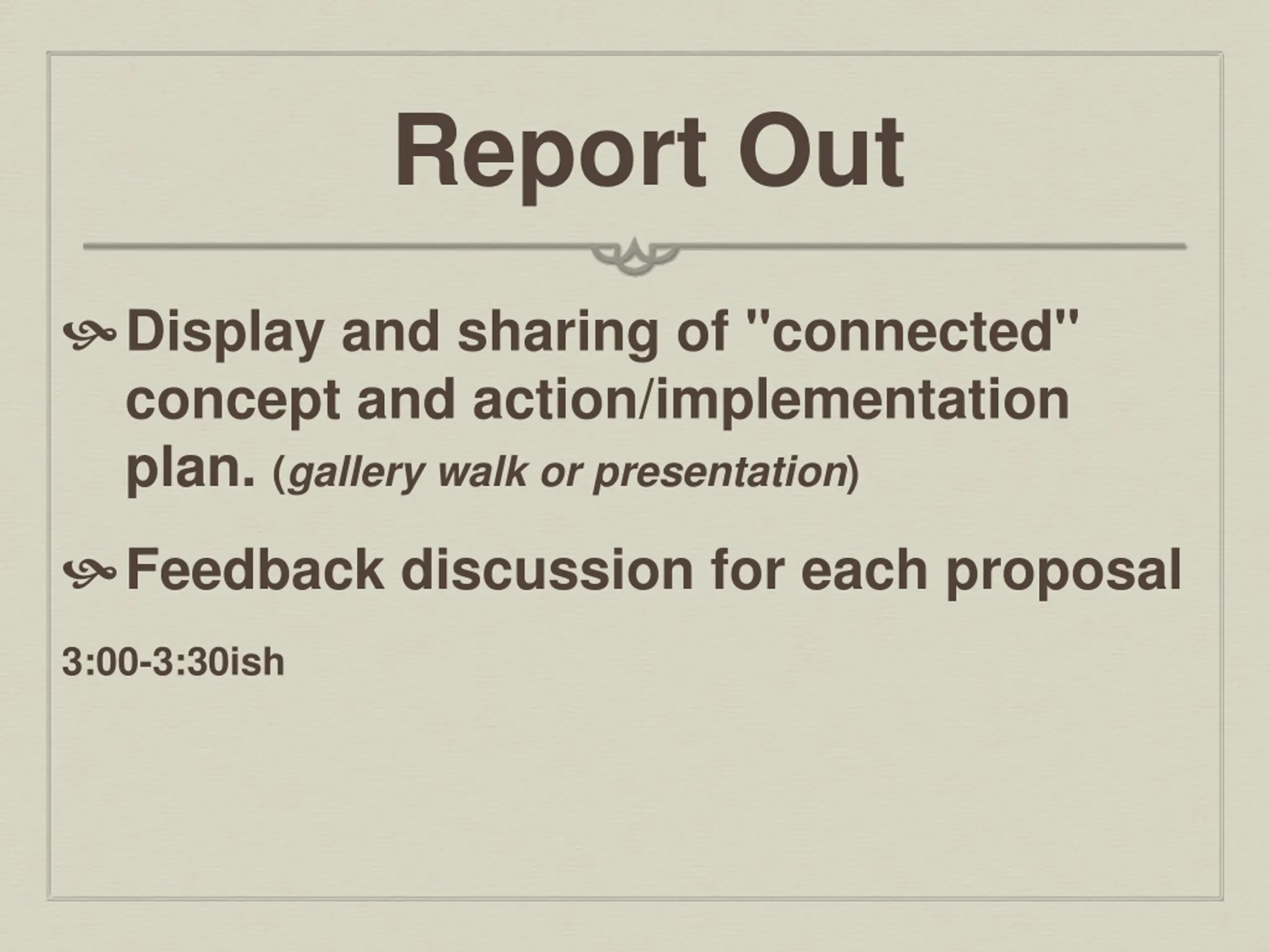 Report Out Display and sharing of "connected" concept and action/implementation plan. (gallery walk or presentation) Feedback discussion for each proposal 3:00-3:30ish