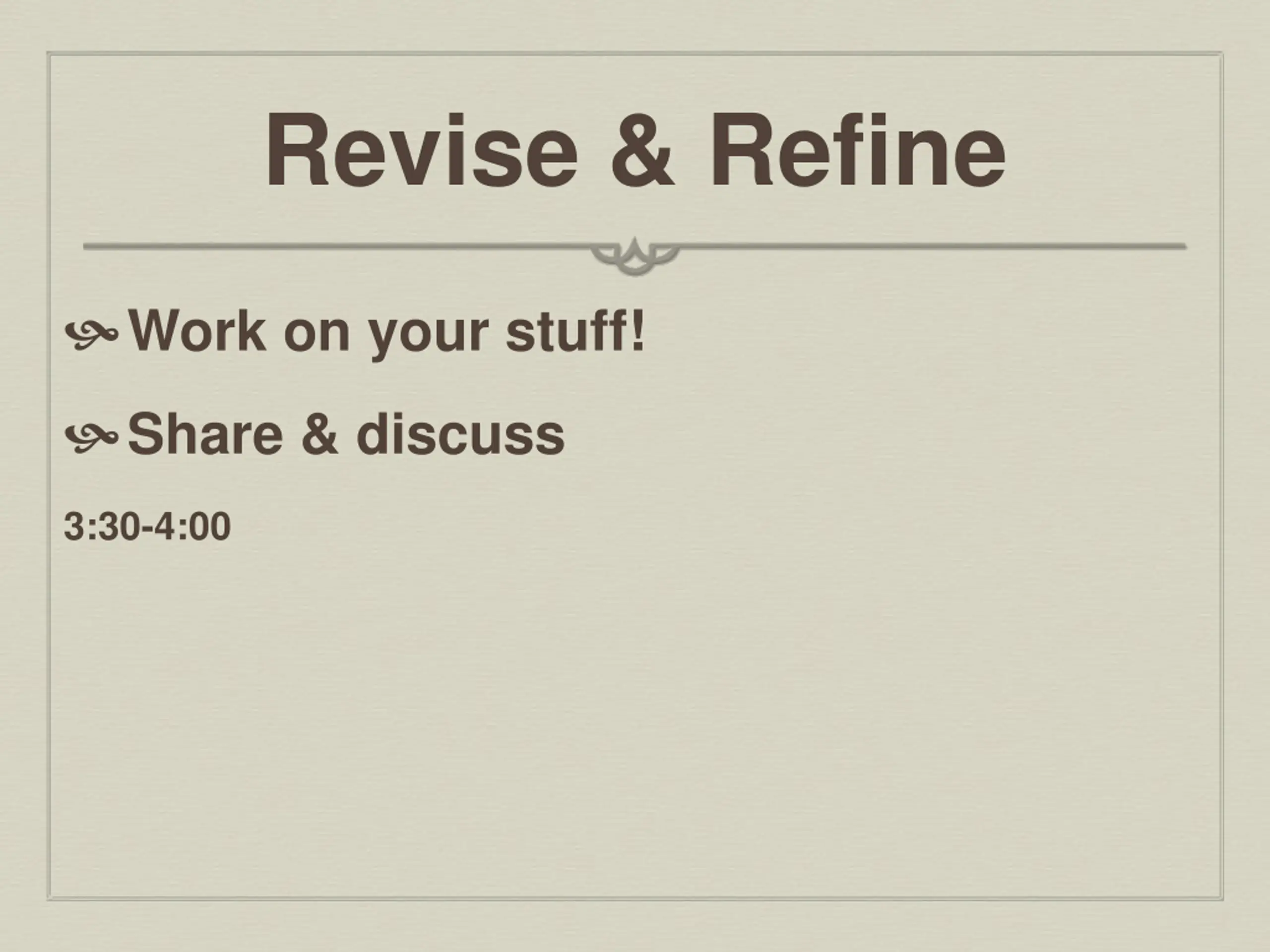Revise & Refine Work on your stuff! Share & discuss 3:30-4:00