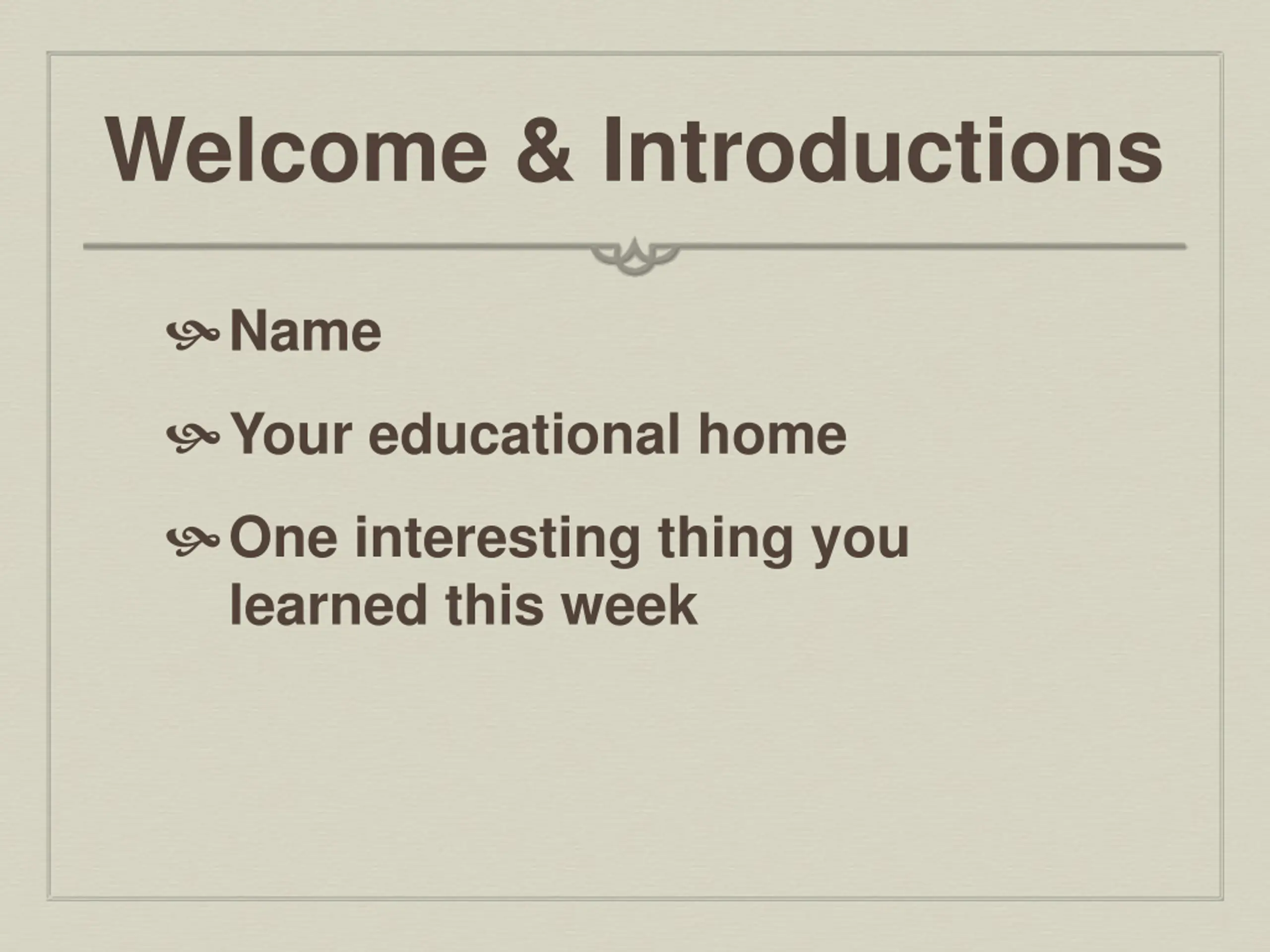 Welcome & Introductions Name Your educational home One interesting thing you learned this week