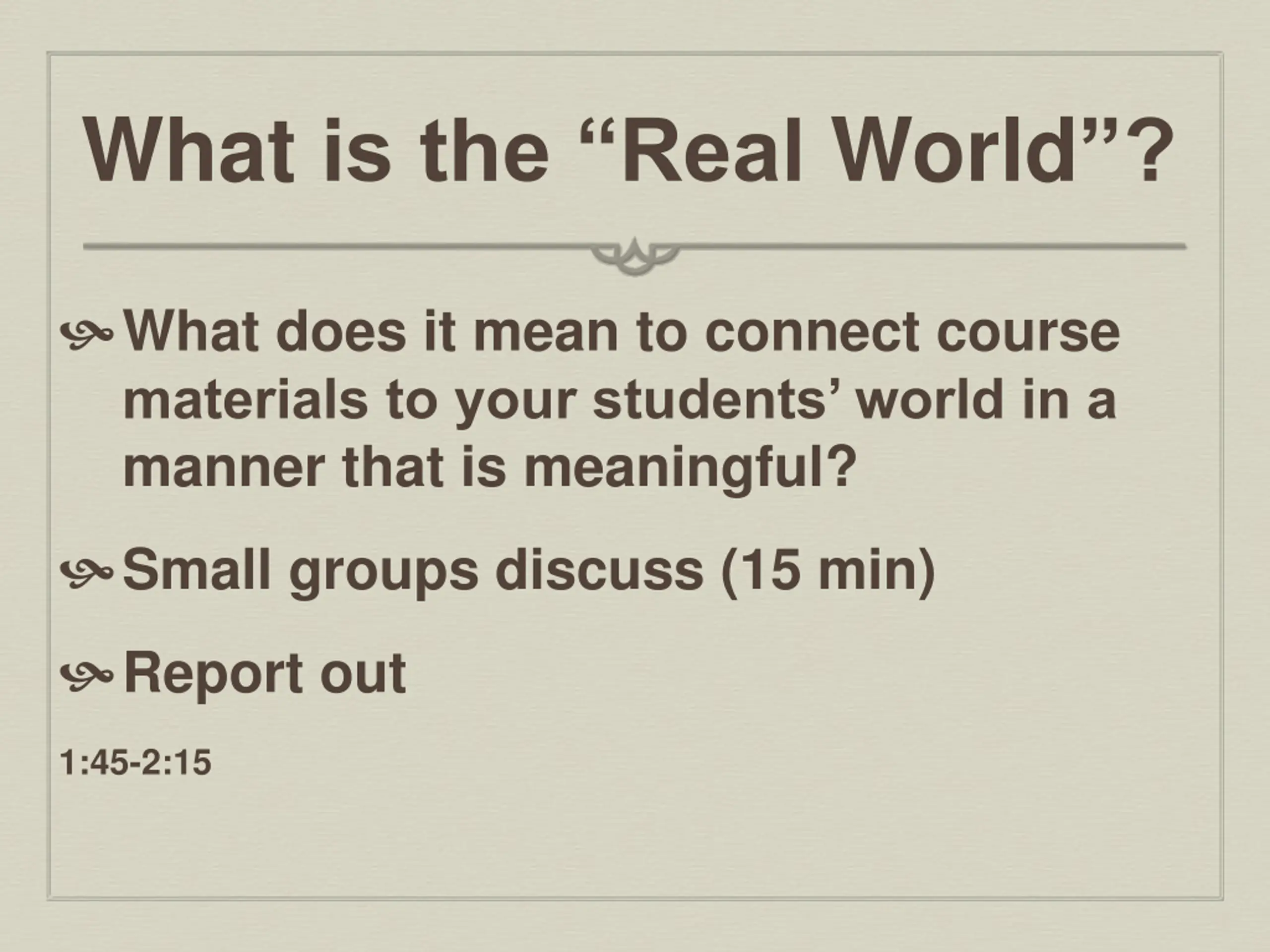 What is the Real World? What does it mean to connect course materials to your students world in a manner that is meaningful? Small groups discuss (15 min) Report out 1:45-2:15