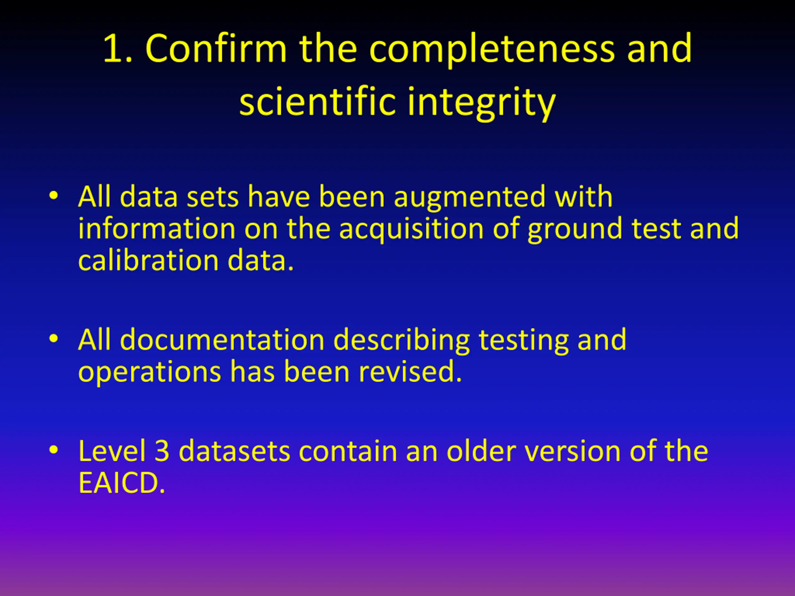 1. Confirm the completeness and scientific integrity All data sets have been augmented with information on the acquisition of ground test and calibration data. All documentation describing testing and operations has been revised. Level 3 datasets contain an older version of the EAICD.