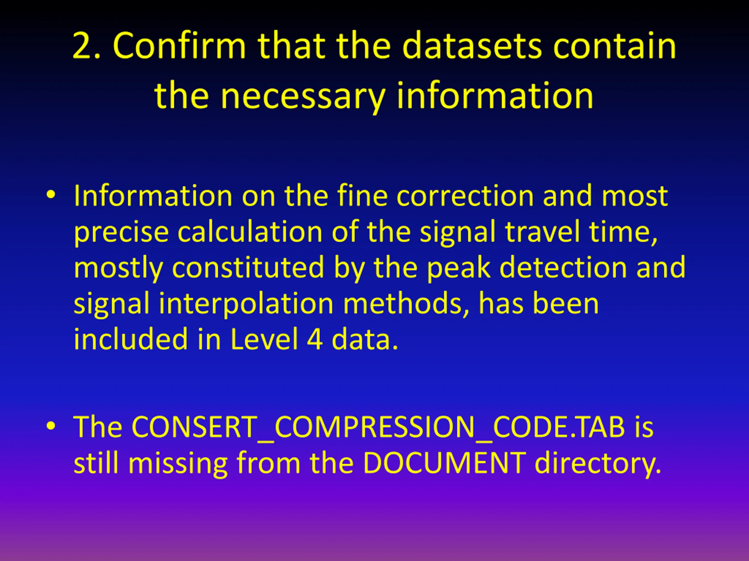 2. Confirm that the datasets contain the necessary information Information on the fine correction and most precise calculation of the signal travel time, mostly constituted by the peak detection and signal interpolation methods, has been included in Level 4 data. The CONSERT_COMPRESSION_CODE.TAB is still missing from the DOCUMENT directory.