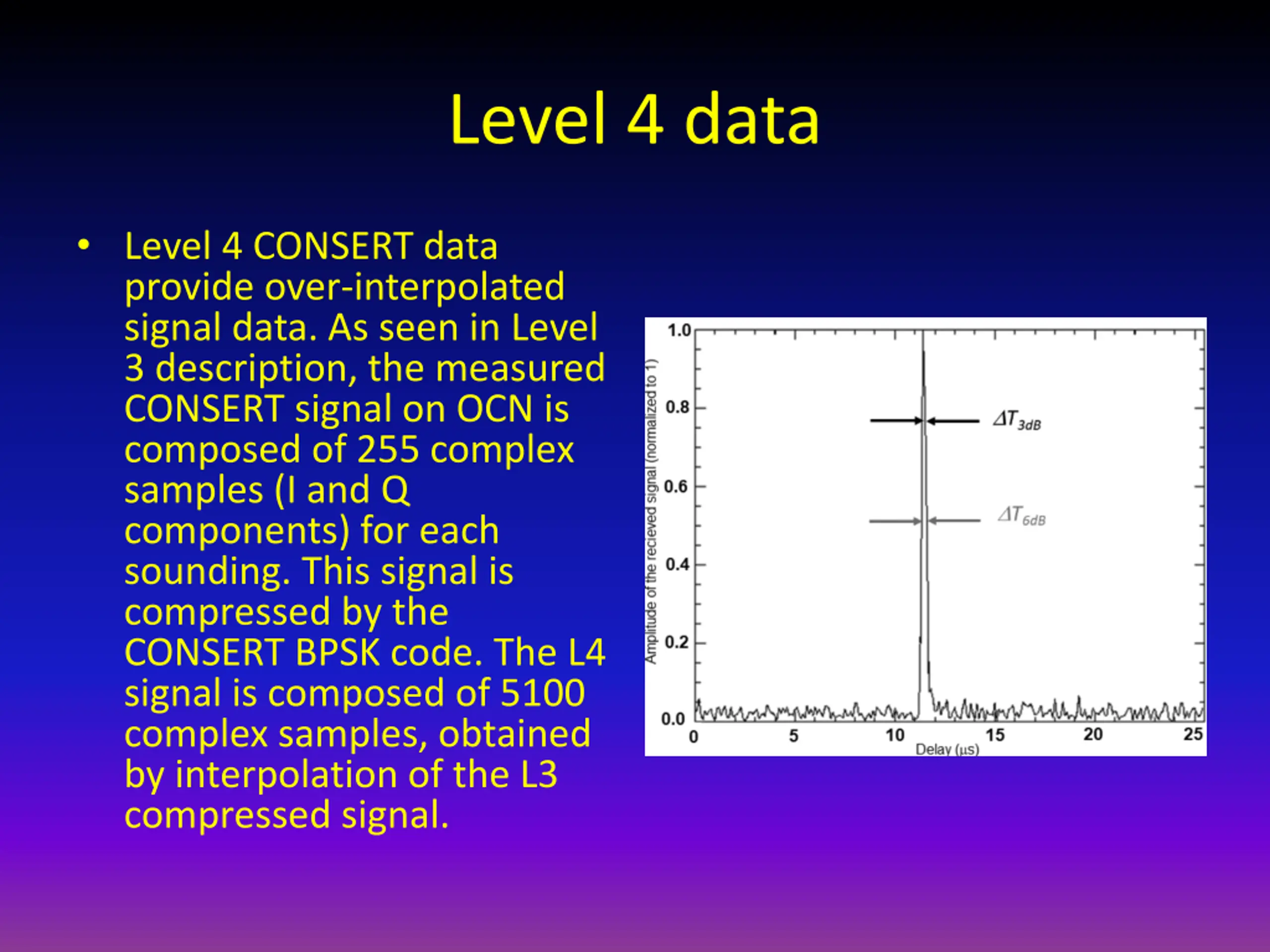 Level 4 data Level 4 CONSERT data provide over-interpolated signal data. As seen in Level 3 description, the measured CONSERT signal on OCN is composed of 255 complex samples (I and Q components) for each sounding. This signal is compressed by the CONSERT BPSK code. The L4 signal is composed of 5100 complex samples, obtained by interpolation of the L3 compressed signal.