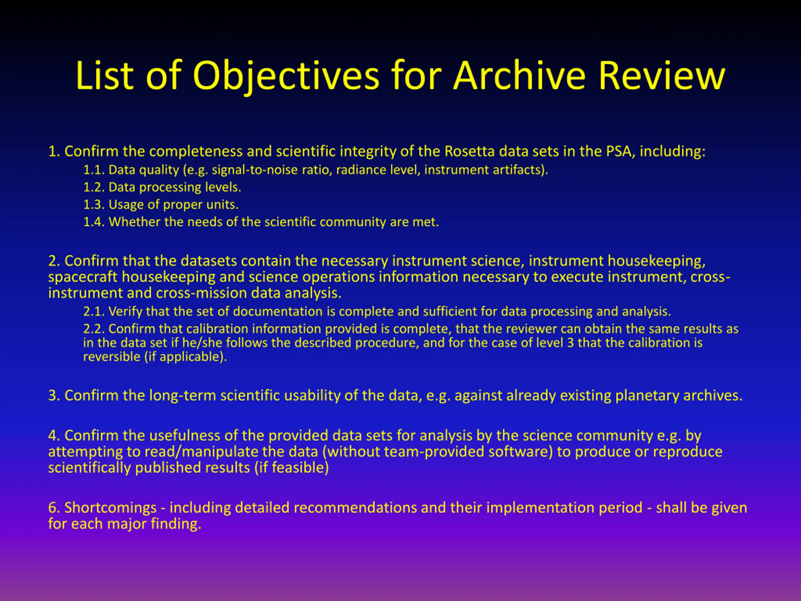 List of Objectives for Archive Review 1. Confirm the completeness and scientific integrity of the Rosetta data sets in the PSA, including: 1.1. Data quality (e.g. signal-to-noise ratio, radiance level, instrument artifacts). 1.2. Data processing levels. 1.3. Usage of proper units. 1.4. Whether the needs of the scientific community are met. 2. Confirm that the datasets contain the necessary instrument science, instrument housekeeping, spacecraft housekeeping and science operations information necessary to execute instrument, cross- instrument and cross-mission data analysis. 2.1. Verify that the set of documentation is complete and sufficient for data processing and analysis. 2.2. Confirm that calibration information provided is complete, that the reviewer can obtain the same results as in the data set if he/she follows the described procedure, and for the case of level 3 that the calibration is reversible (if applicable). 3. Confirm the long-term scientific usability of the data, e.g. against already existing planetary archives. 4. Confirm the usefulness of the provided data sets for analysis by the science community e.g. by attempting to read/manipulate the data (without team-provided software) to produce or reproduce scientifically published results (if feasible) 6. Shortcomings - including detailed recommendations and their implementation period - shall be given for each major finding.