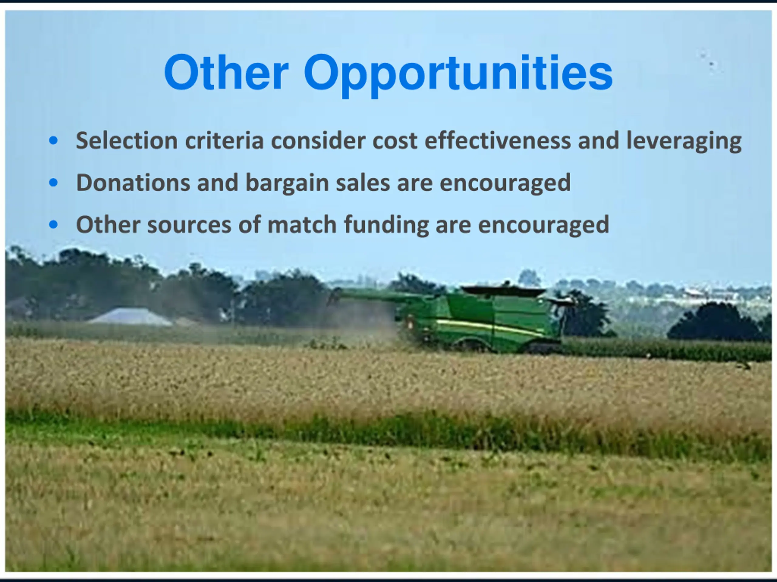 Other Opportunities Selection criteria consider cost effectiveness and leveraging Donations and bargain sales are encouraged Other sources of match funding are encouraged