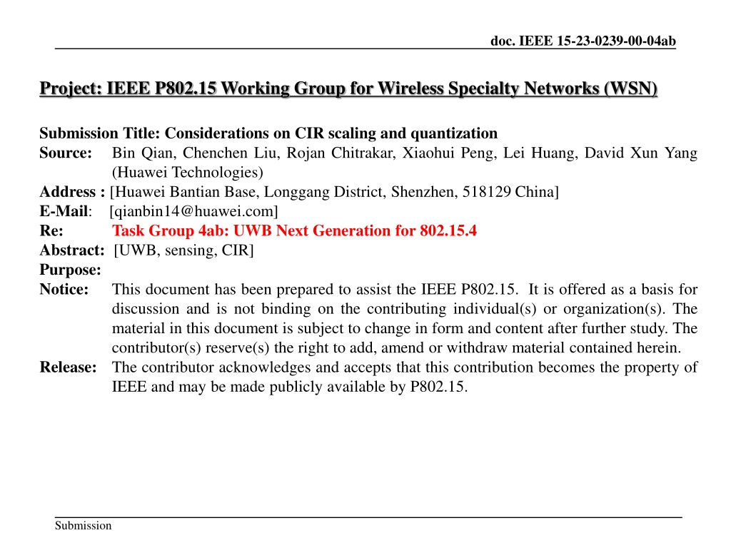 doc. IEEE 15-23-0239-00-04ab Project: IEEE P802.15 Working Group for Wireless Specialty Networks (WSN) Submission Title: Considerations on CIR scaling and quantization Source: Bin Qian, Chenchen Liu, Rojan Chitrakar, Xiaohui Peng, Lei Huang, David Xun Yang (Huawei Technologies) Address : [Huawei Bantian Base, Longgang District, Shenzhen, 518129 China] E-Mail: [qianbin14@huawei.com] Re: Task Group 4ab: UWB Next Generation for 802.15.4 Abstract: [UWB, sensing, CIR] Purpose: Notice: This document has been prepared to assist the IEEE P802.15. It is offered as a basis for discussion and is not binding on the contributing individual(s) or organization(s). The material in this document is subject to change in form and content after further study. The contributor(s) reserve(s) the right to add, amend or withdraw material contained herein. Release: The contributor acknowledges and accepts that this contribution becomes the property of IEEE and may be made publicly available by P802.15. Submission
