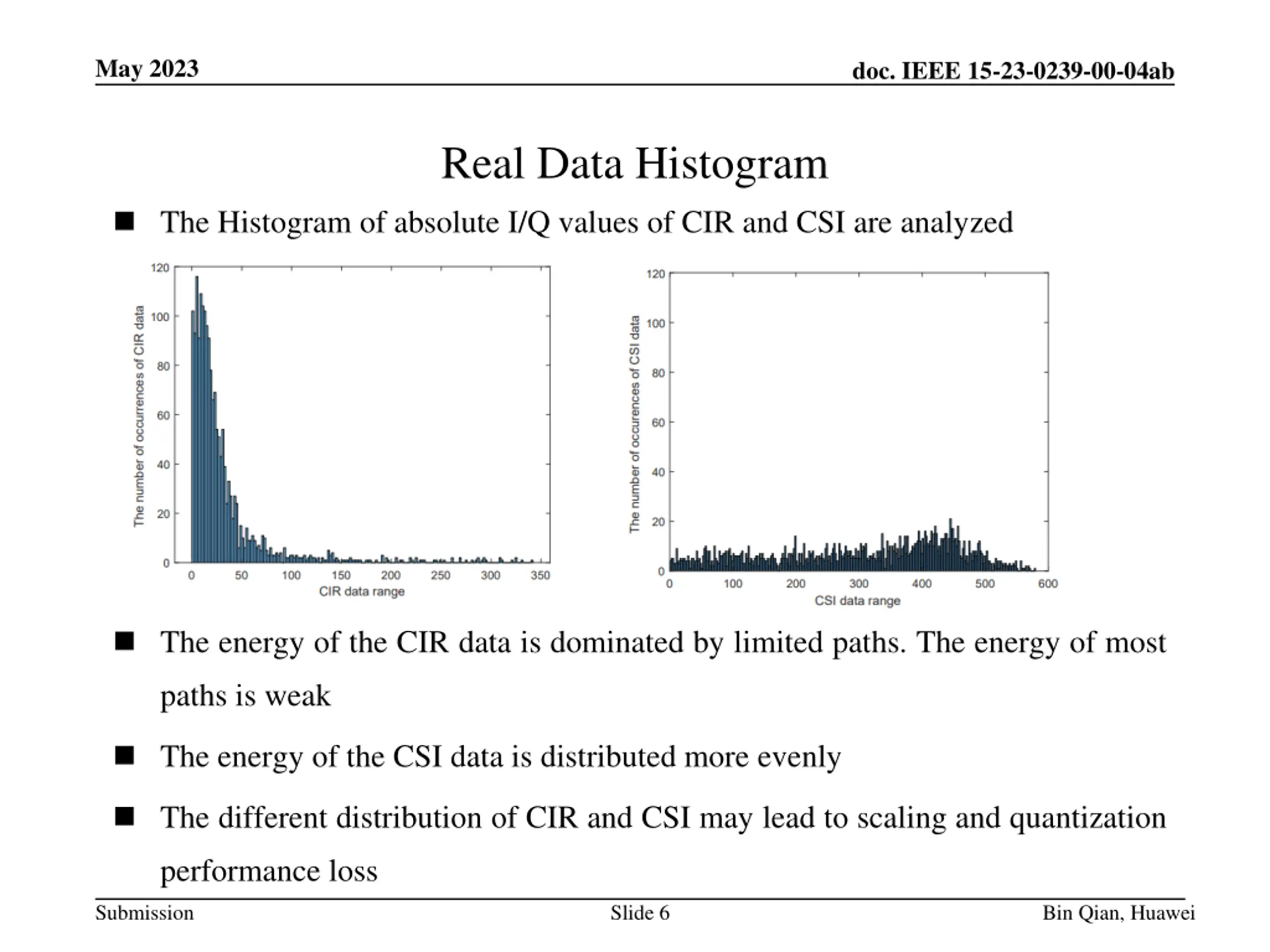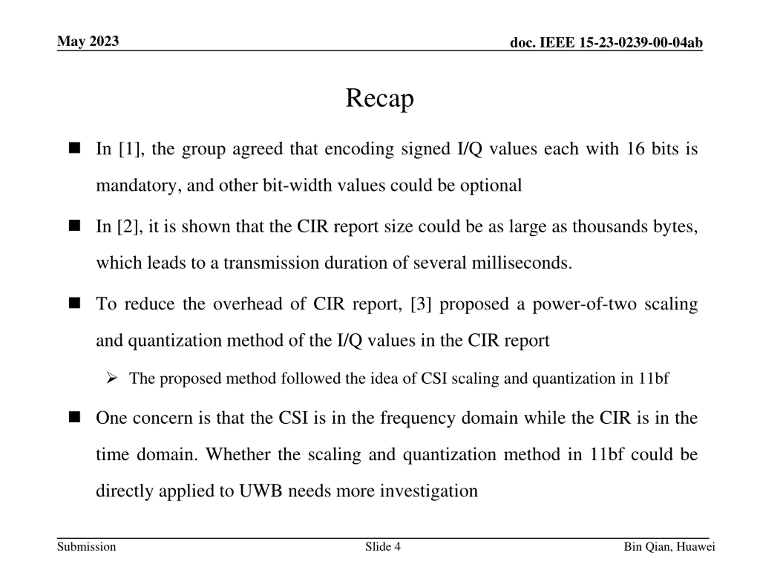 May 2023 doc. IEEE 15-23-0239-00-04ab Recap In [1], the group agreed that encoding signed I/Q values each with 16 bits is mandatory, and other bit-width values could be optional In [2], it is shown that the CIR report size could be as large as thousands bytes, which leads to a transmission duration of several milliseconds. To reduce the overhead of CIR report, [3] proposed a power-of-two scaling and quantization method of the I/Q values in the CIR report The proposed method followed the idea of CSI scaling and quantization in 11bf One concern is that the CSI is in the frequency domain while the CIR is in the time domain. Whether the scaling and quantization method in 11bf could be directly applied to UWB needs more investigation Submission Slide 4 Bin Qian, Huawei