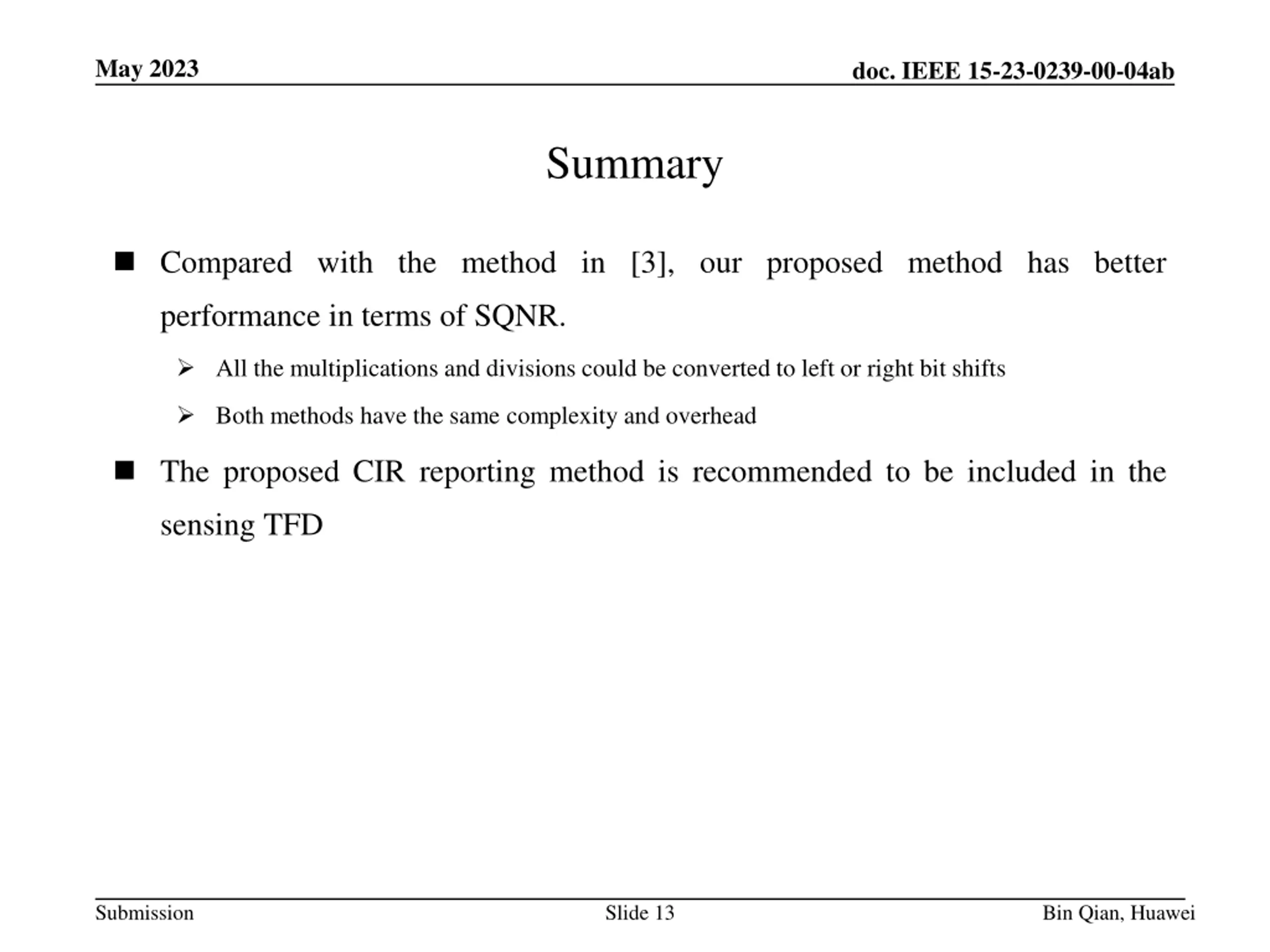 May 2023 doc. IEEE 15-23-0239-00-04ab Summary Compared with the method in [3], our proposed method has better performance in terms of SQNR. All the multiplications and divisions could be converted to left or right bit shifts Both methods have the same complexity and overhead The proposed CIR reporting method is recommended to be included in the sensing TFD Submission Slide 13 Bin Qian, Huawei