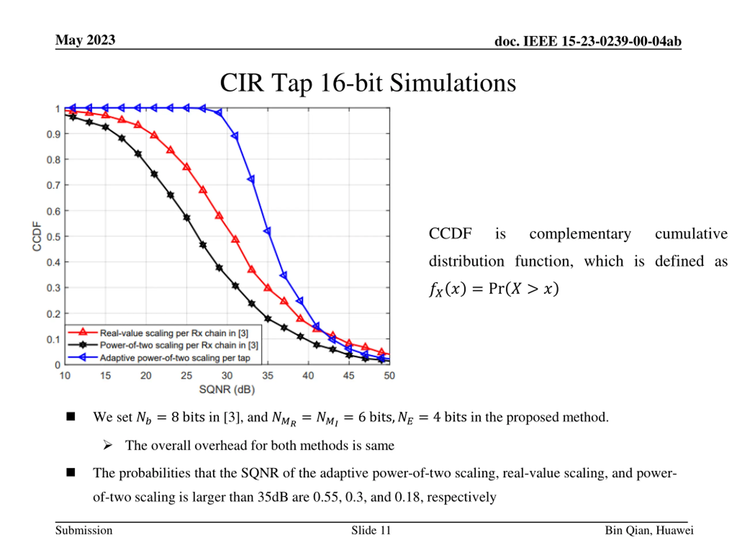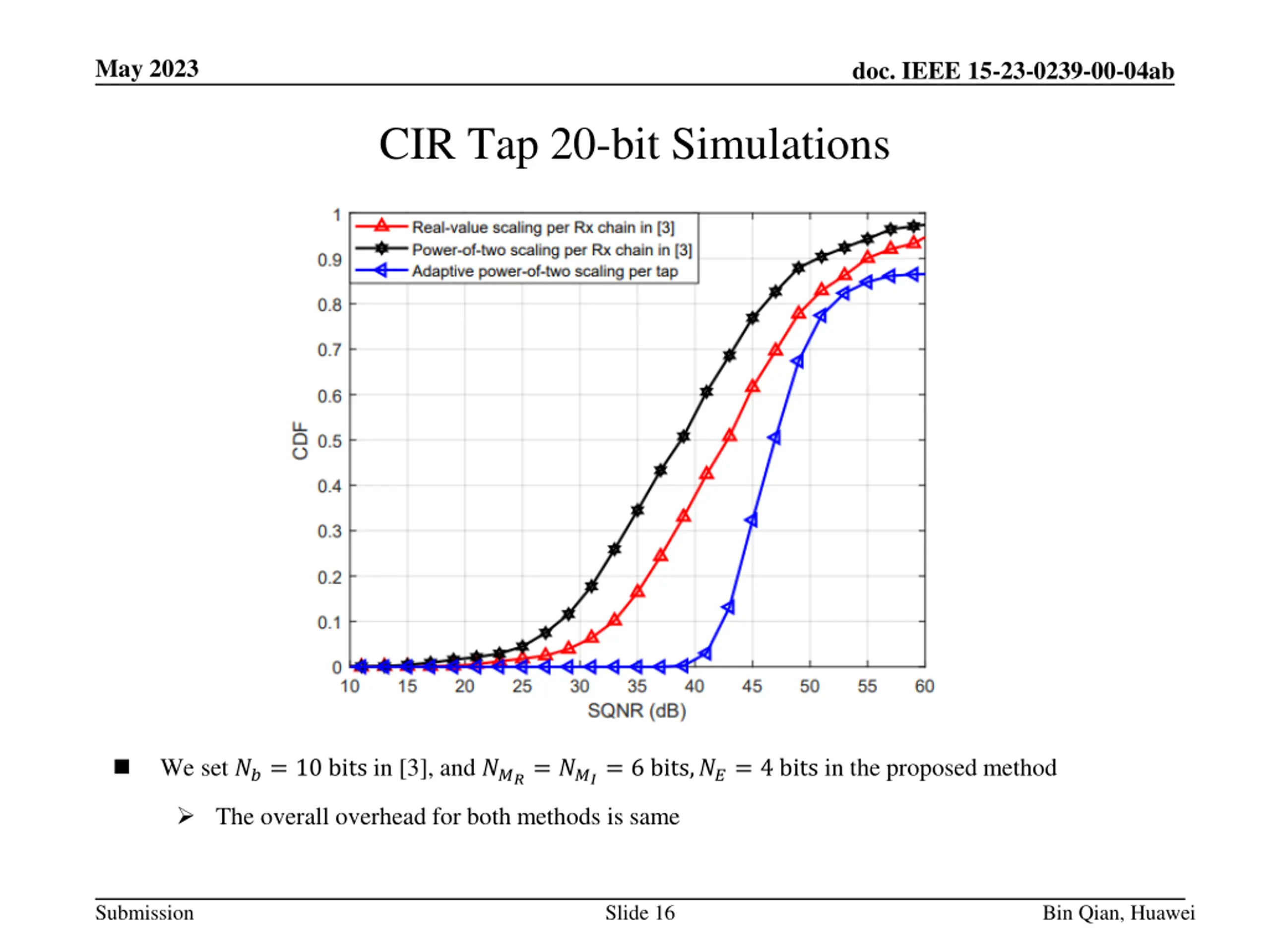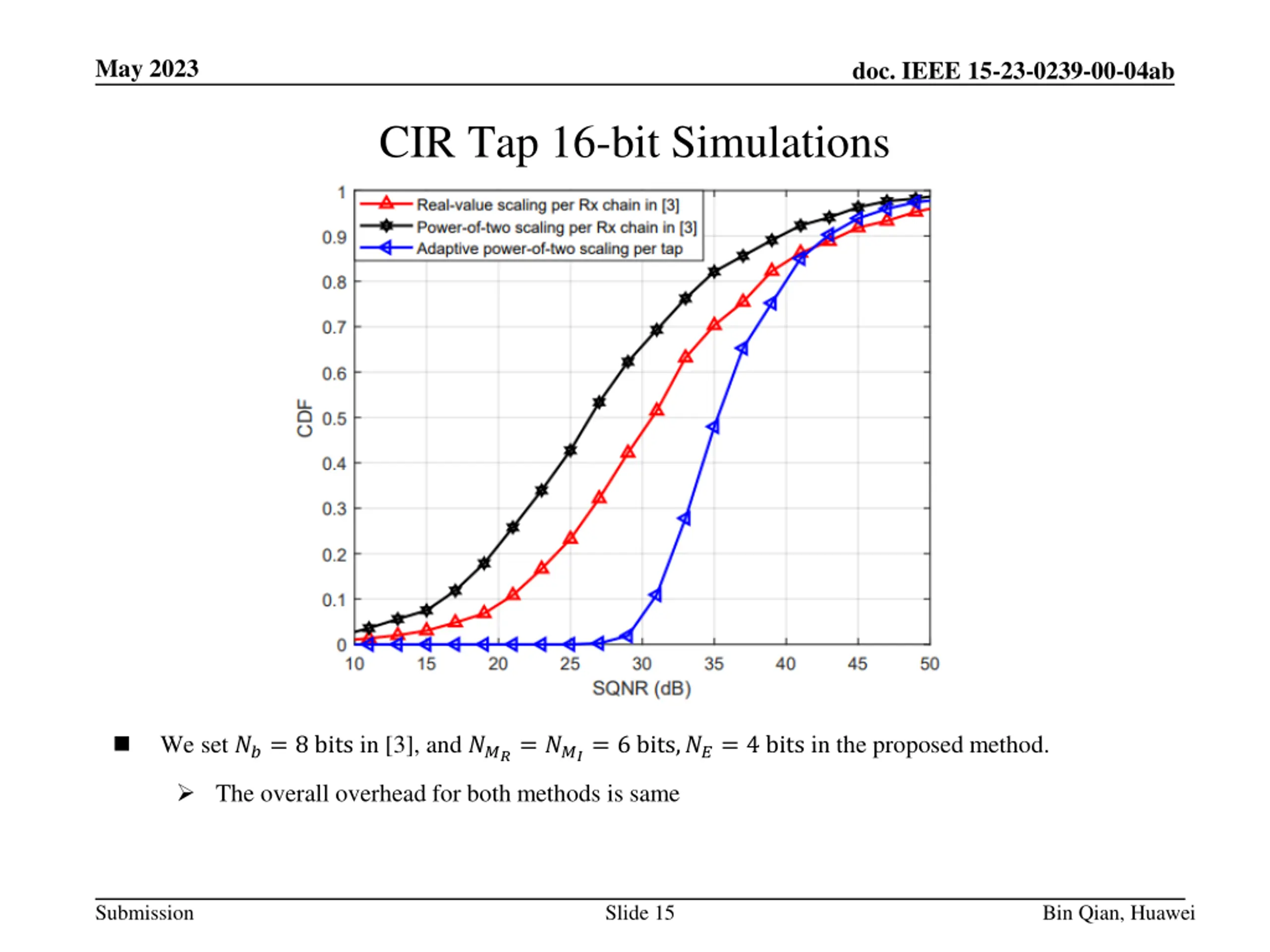 May 2023 doc. IEEE 15-23-0239-00-04ab CIR Tap 16-bit Simulations We set ??= 8 bits in [3], and ???= ???= 6 bits,??= 4 bits in the proposed method. The overall overhead for both methods is same Submission Slide 15 Bin Qian, Huawei