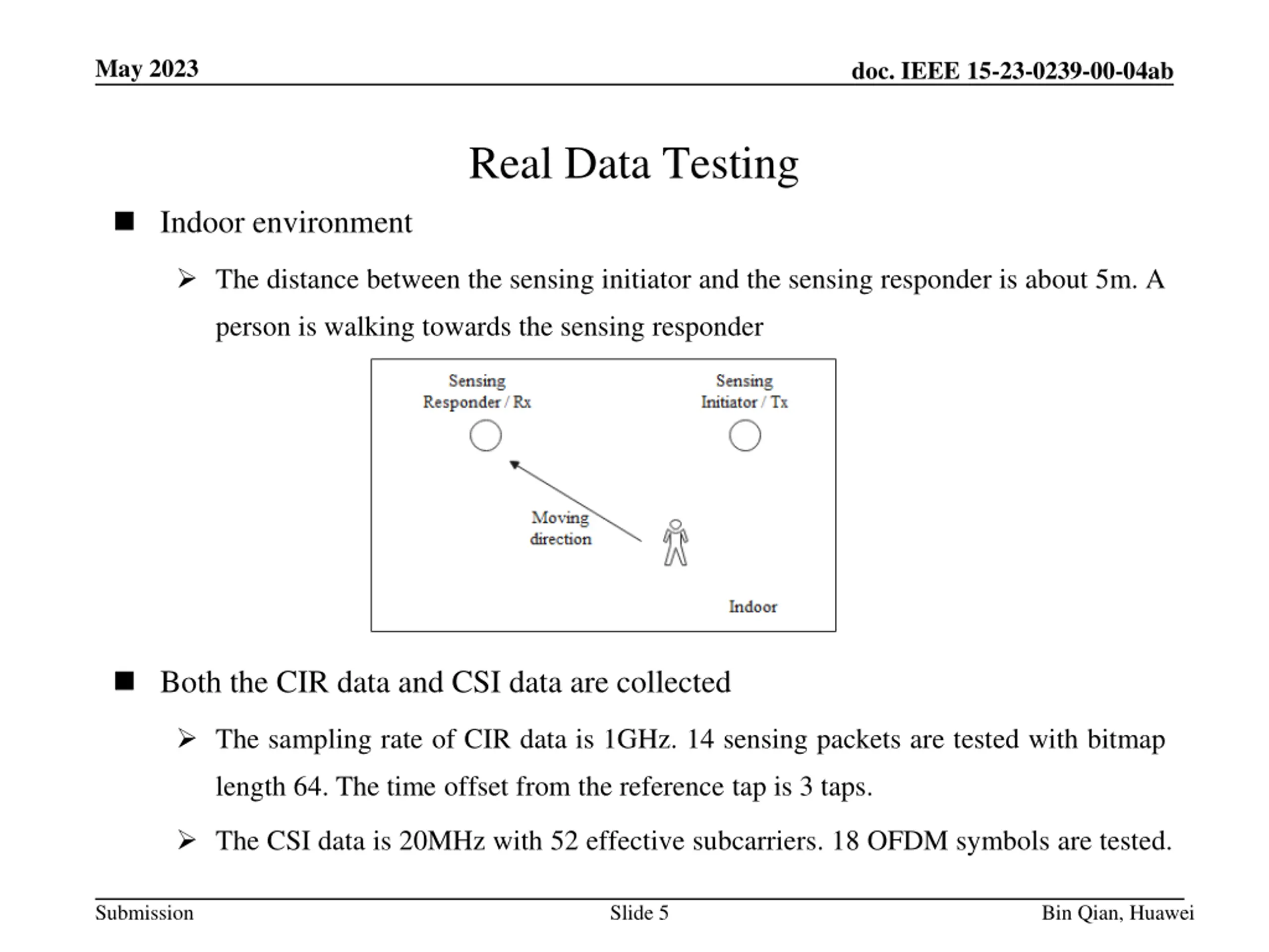 May 2023 doc. IEEE 15-23-0239-00-04ab Real Data Testing Indoor environment The distance between the sensing initiator and the sensing responder is about 5m. A person is walking towards the sensing responder Both the CIR data and CSI data are collected The sampling rate of CIR data is 1GHz. 14 sensing packets are tested with bitmap length 64. The time offset from the reference tap is 3 taps. The CSI data is 20MHz with 52 effective subcarriers. 18 OFDM symbols are tested. Submission Slide 5 Bin Qian, Huawei