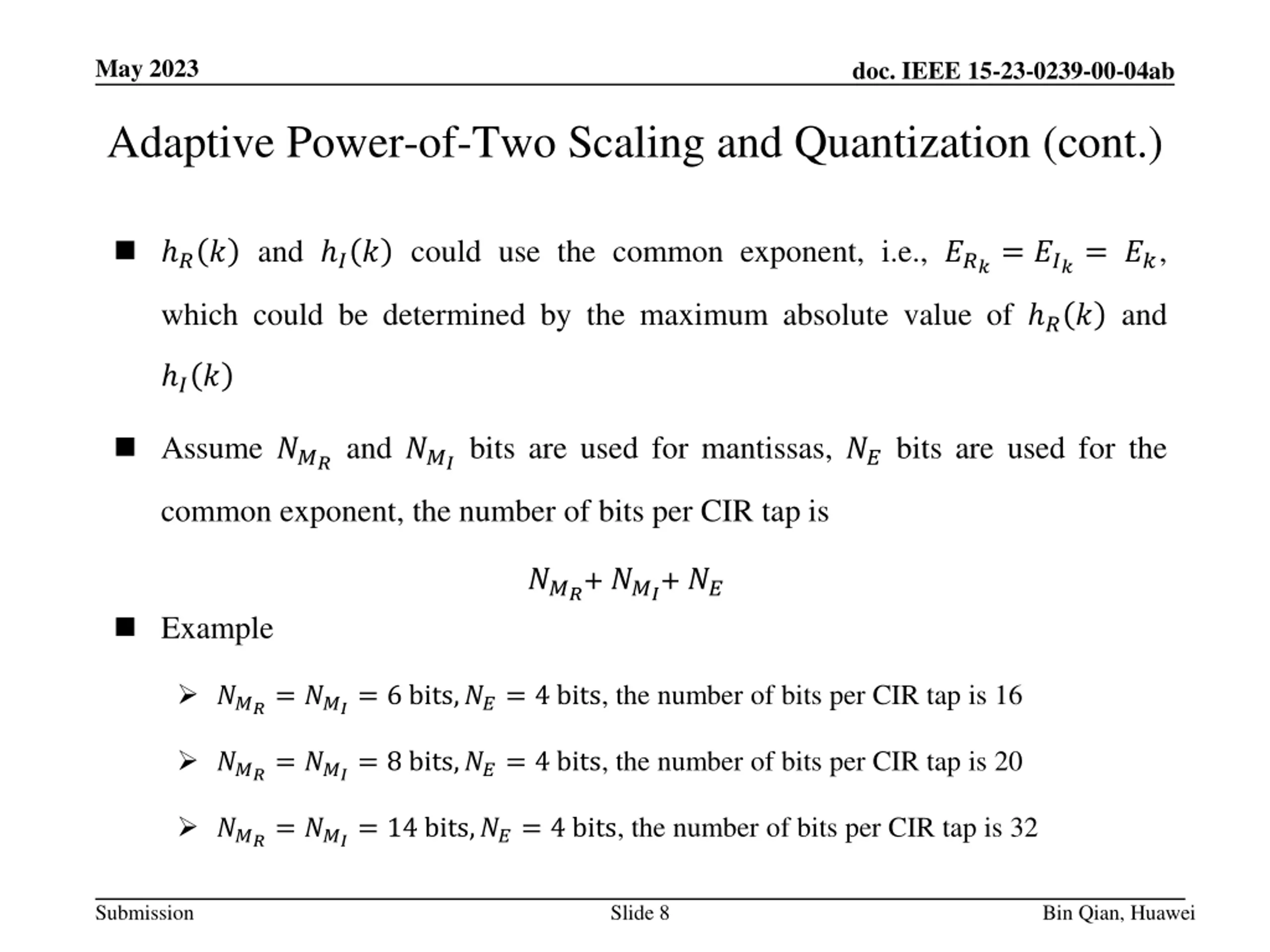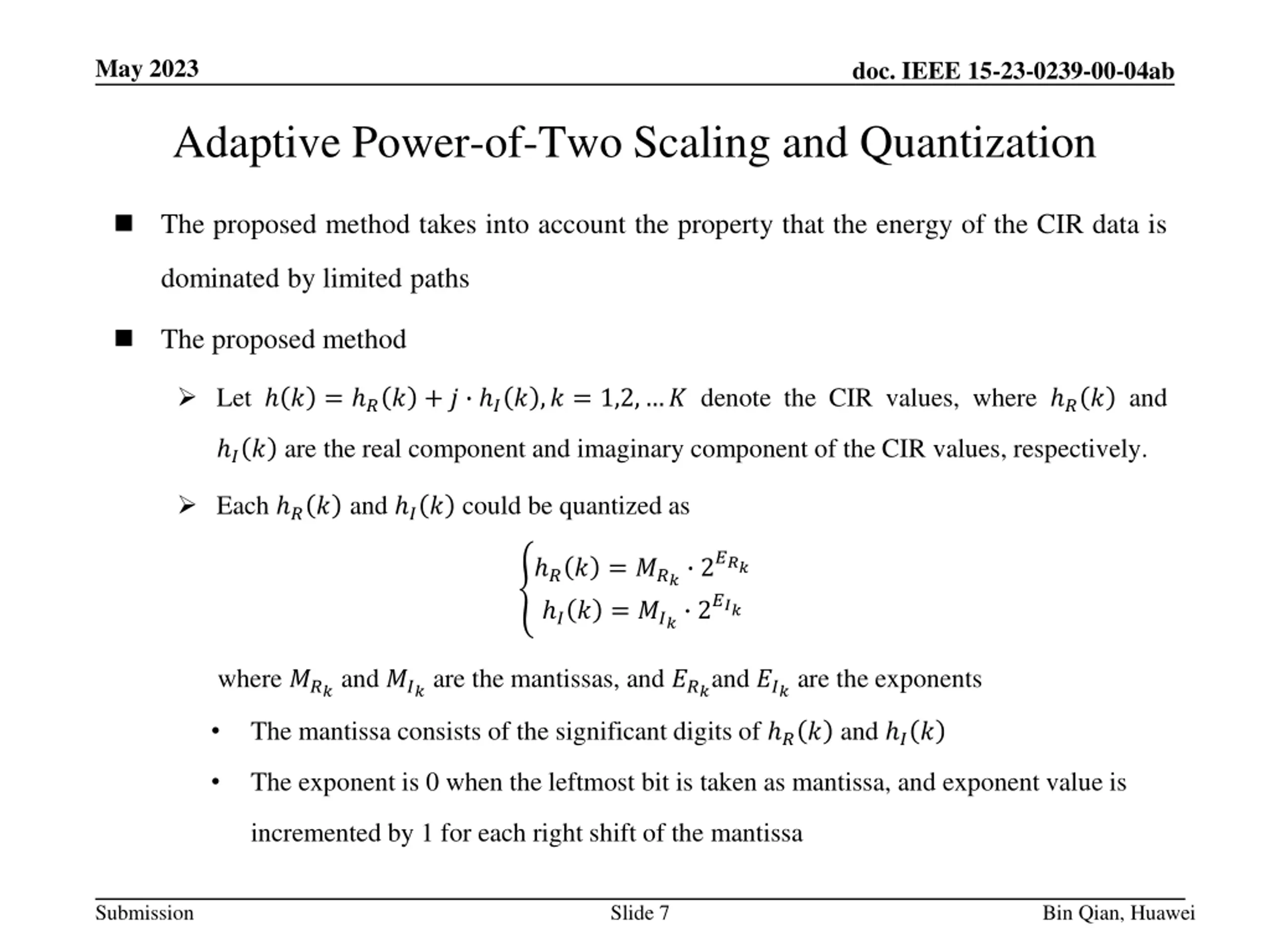 May 2023 doc. IEEE 15-23-0239-00-04ab Adaptive Power-of-Two Scaling and Quantization The proposed method takes into account the property that the energy of the CIR data is dominated by limited paths The proposed method Let ? = ?? + ? ?? ,? = 1,2, ? denote the CIR values, where ?? and ?? are the real component and imaginary component of the CIR values, respectively. Each ??and ?? could be quantized as ?? = ??? 2??? ?? = ??? 2??? where ??? and ??? are the mantissas, and ???and ??? are the exponents The mantissa consists of the significant digits of ?? and ?? The exponent is 0 when the leftmost bit is taken as mantissa, and exponent value is incremented by 1 for each right shift of the mantissa Submission Slide 7 Bin Qian, Huawei