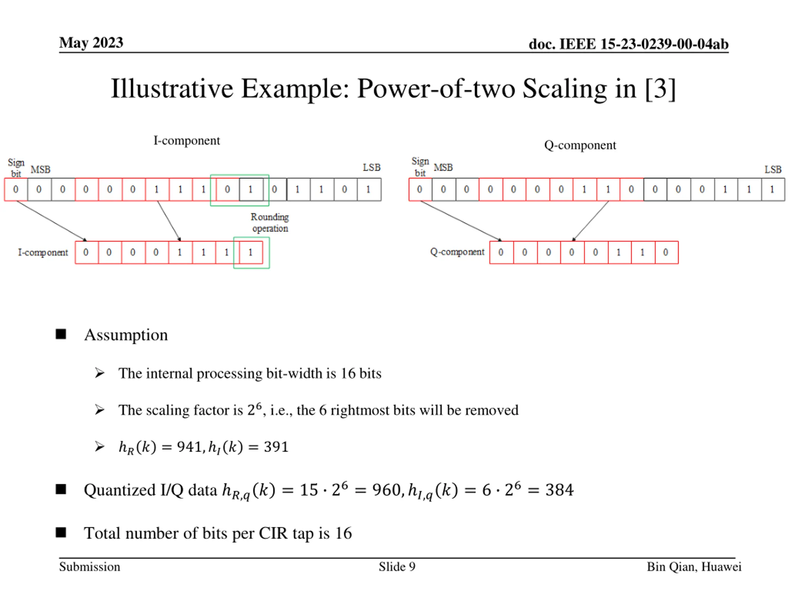 May 2023 doc. IEEE 15-23-0239-00-04ab Adaptive Power-of-Two Scaling and Quantization (cont.) ?? and ?? could use the common exponent, i.e., ???= ???= ??, which could be determined by the maximum absolute value of ?? and ?? Assume ??? and ??? bits are used for mantissas, ??bits are used for the common exponent, the number of bits per CIR tap is ???+ ???+ ?? Example ???= ???= 6 bits,??= 4 bits, the number of bits per CIR tap is 16 ???= ???= 8 bits,??= 4 bits, the number of bits per CIR tap is 20 ???= ???= 14 bits,??= 4 bits, the number of bits per CIR tap is 32 Submission Slide 8 Bin Qian, Huawei