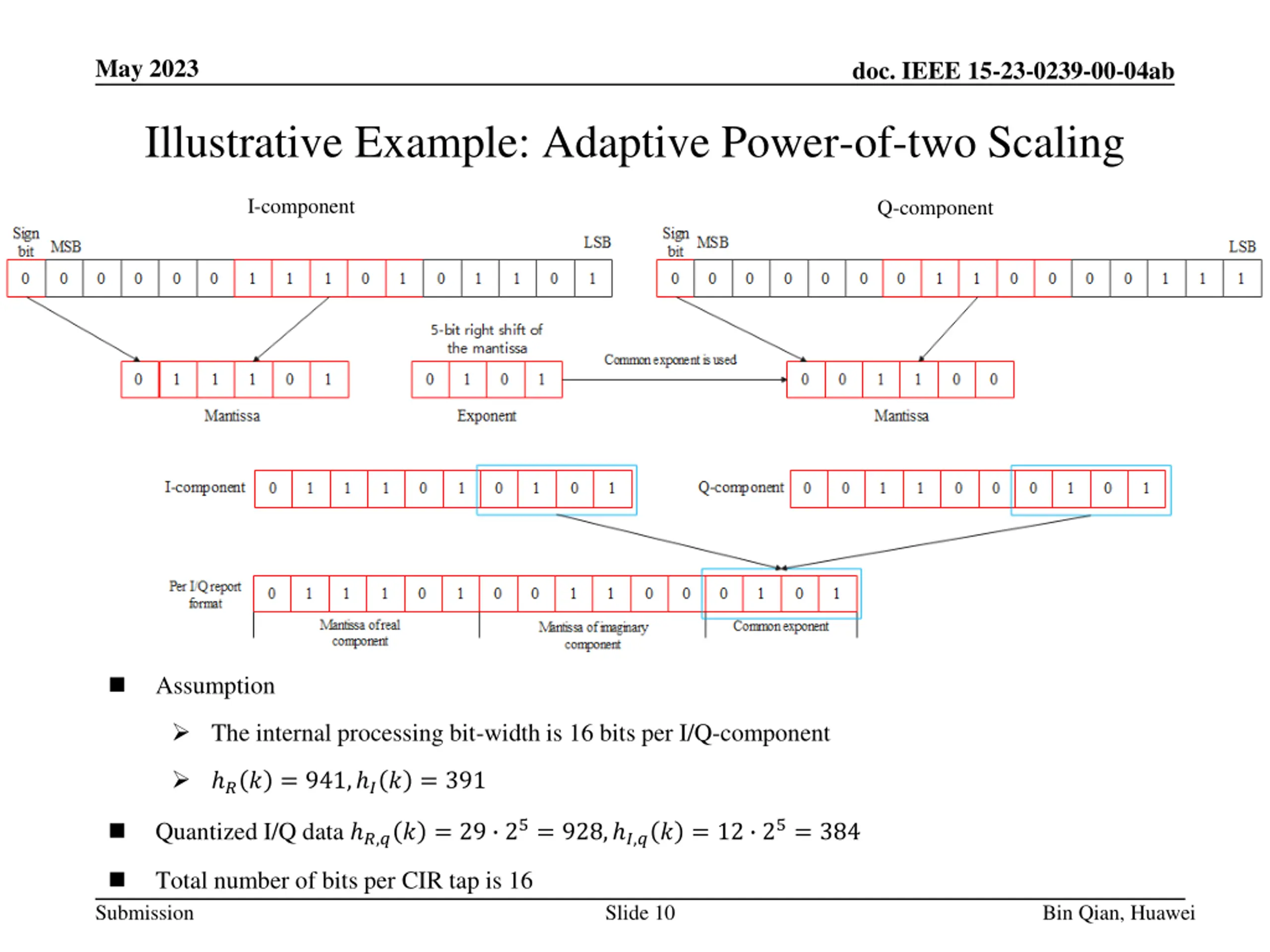 May 2023 doc. IEEE 15-23-0239-00-04ab Illustrative Example: Power-of-two Scaling in [3] I-component Q-component Assumption The internal processing bit-width is 16 bits The scaling factor is 26, i.e., the 6 rightmost bits will be removed ?? = 941, ?? = 391 Quantized I/Q data ?,?? = 15 26= 960, ?,?? = 6 26= 384 Total number of bits per CIR tap is 16 Submission Slide 9 Bin Qian, Huawei