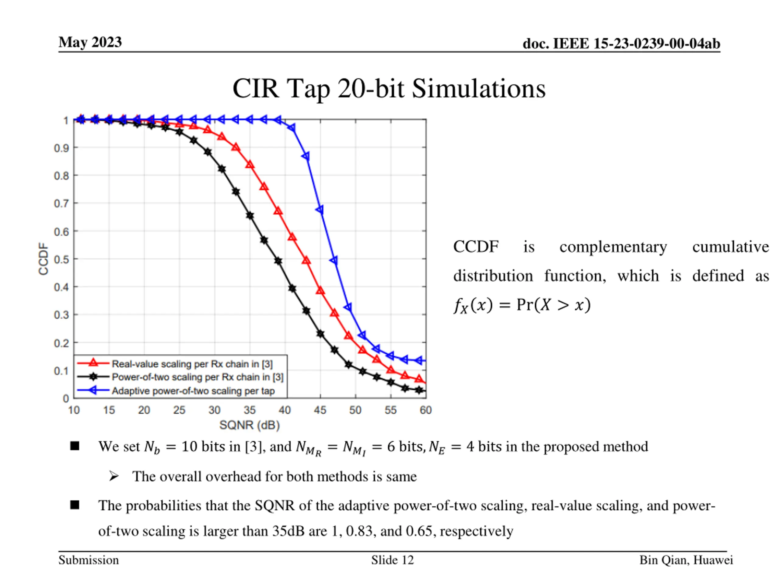 May 2023 doc. IEEE 15-23-0239-00-04ab CIR Tap 16-bit Simulations CCDF is complementary cumulative distribution function, which is defined as ??? = Pr ? > ? We set ??= 8 bits in [3], and ???= ???= 6 bits,??= 4 bits in the proposed method. The overall overhead for both methods is same The probabilities that the SQNR of the adaptive power-of-two scaling, real-value scaling, and power- of-two scaling is larger than 35dB are 0.55, 0.3, and 0.18, respectively Submission Slide 11 Bin Qian, Huawei