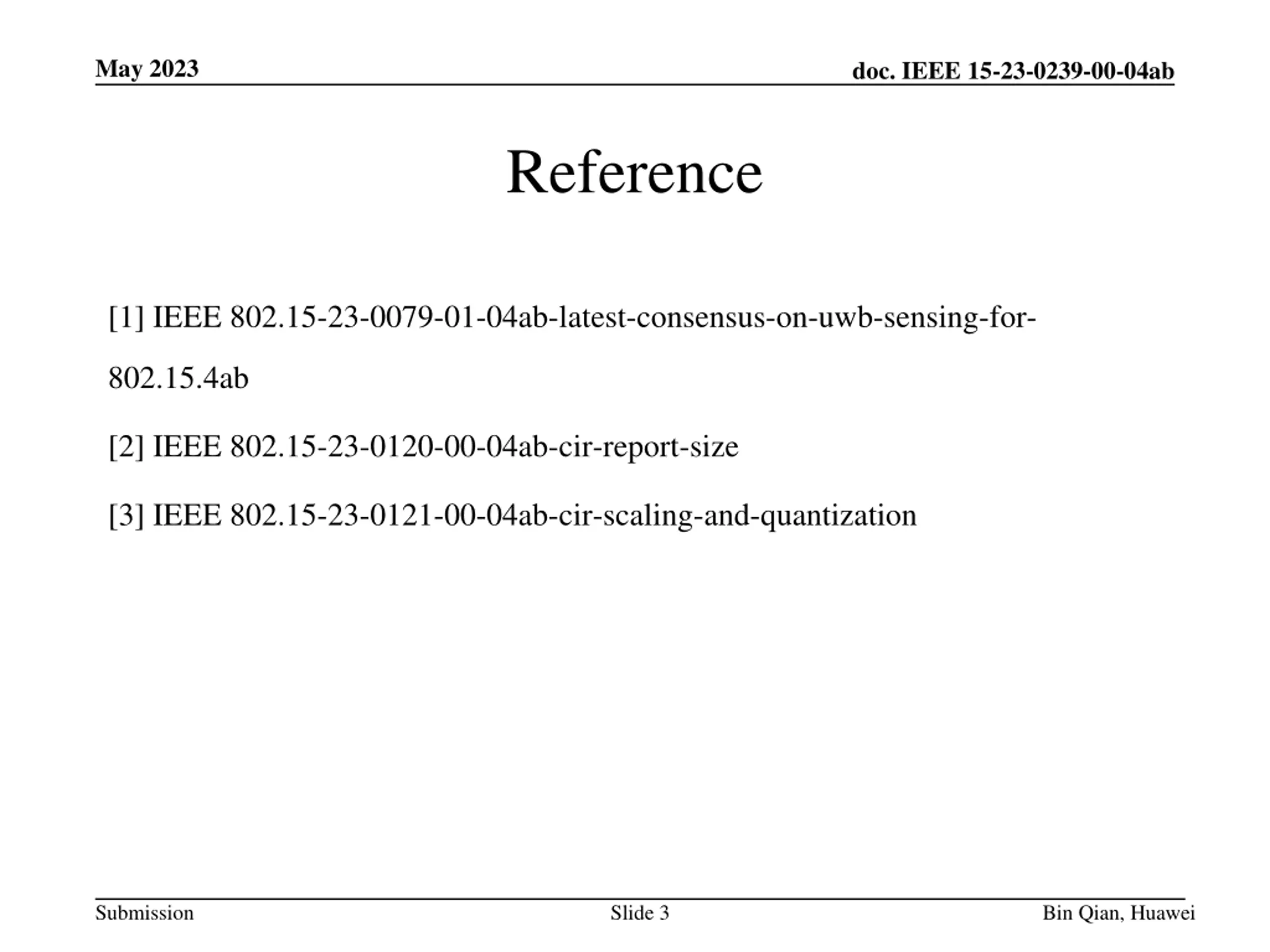 May 2023 doc. IEEE 15-23-0239-00-04ab Reference [1] IEEE 802.15-23-0079-01-04ab-latest-consensus-on-uwb-sensing-for- 802.15.4ab [2] IEEE 802.15-23-0120-00-04ab-cir-report-size [3] IEEE 802.15-23-0121-00-04ab-cir-scaling-and-quantization Submission Slide 3 Bin Qian, Huawei