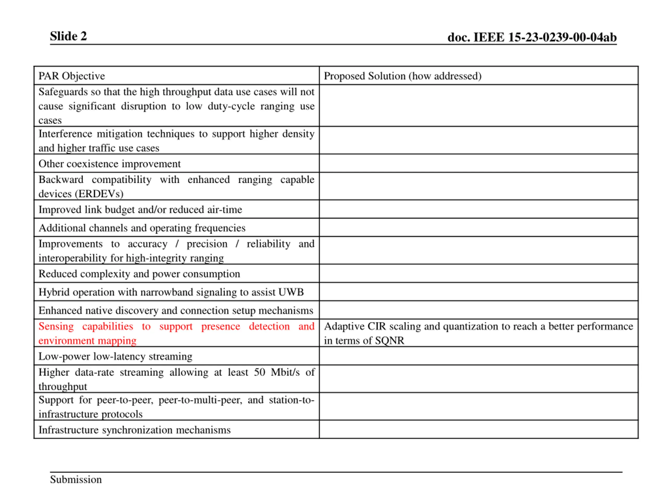 Slide 2 doc. IEEE 15-23-0239-00-04ab PAR Objective Safeguards so that the high throughput data use cases will not cause significant disruption to low duty-cycle ranging use cases Interference mitigation techniques to support higher density and higher traffic use cases Other coexistence improvement Backward compatibility with enhanced ranging capable devices (ERDEVs) Improved link budget and/or reduced air-time Proposed Solution (how addressed) Additional channels and operating frequencies Improvements to accuracy / precision / reliability and interoperability for high-integrity ranging Reduced complexity and power consumption Hybrid operation with narrowband signaling to assist UWB Enhanced native discovery and connection setup mechanisms Sensing capabilities to support presence detection and environment mapping Low-power low-latency streaming Higher data-rate streaming allowing at least 50 Mbit/s of throughput Support for peer-to-peer, peer-to-multi-peer, and station-to- infrastructure protocols Infrastructure synchronization mechanisms Adaptive CIR scaling and quantization to reach a better performance in terms of SQNR Submission